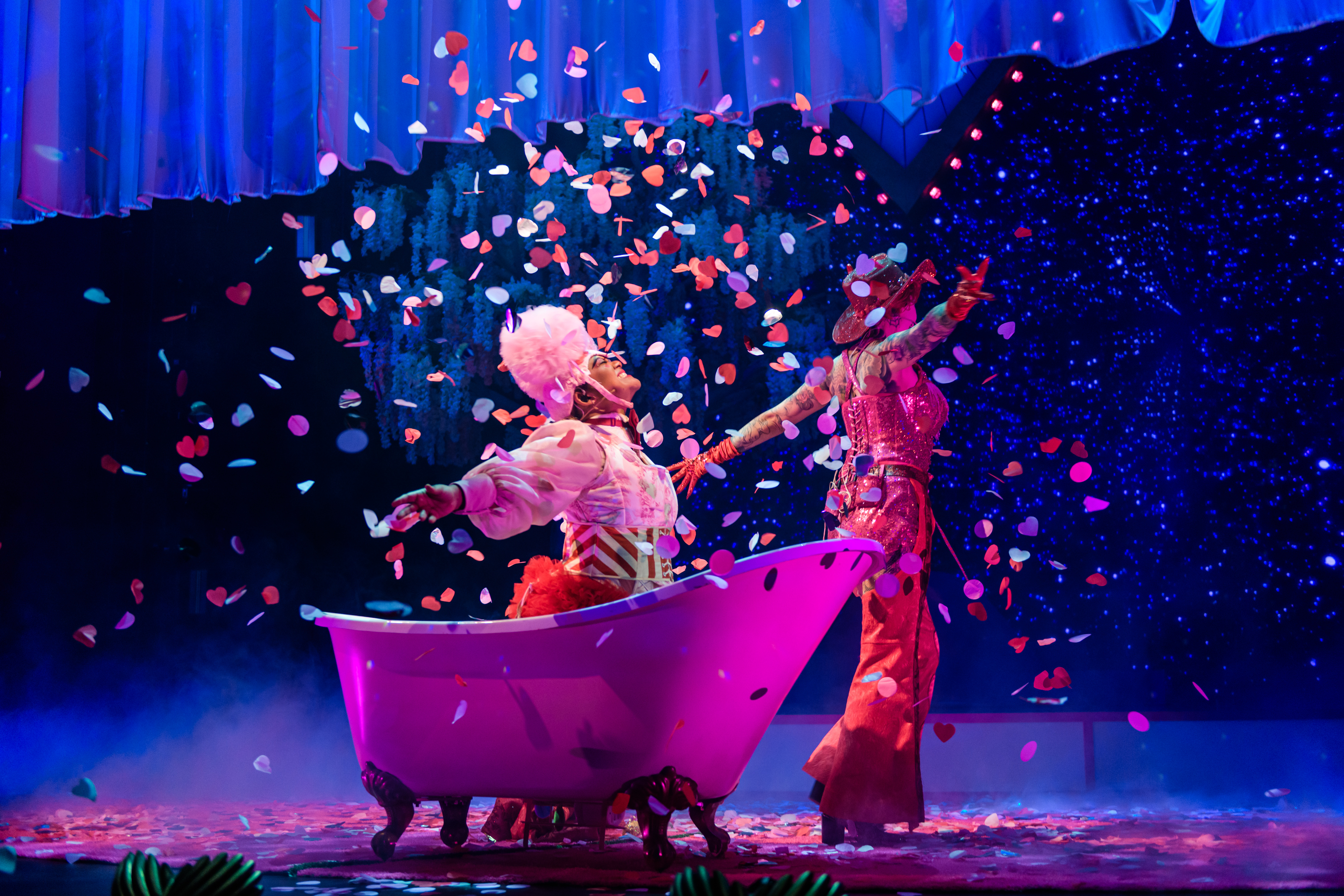 In a production boldly directed by Nick Skubij for maximum theatrical impact, lighting designer Trent Suidgeest saturated the stage with glowing Barbie pinks and blushing hues. The lighting projections were stunning – a bruised sky of roiling clouds, glittering stars and shifting, vivid abstractions with fog machines.