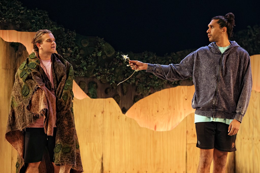 Co-directed by Declan Greene and Amy Sole, the play features two assured, sensitive performances from Joseph Althouse (The Visitors) as Ty, and Danny Howard (Jacky) as Neddy. At 16 years old, the two boys meet up when they’re tasked by their mobs (Ty is River Mob; Neddy is Mountain Mob) to share and find information regarding what the Whitefella invaders are up to. While doing the things boys that age do – joking around, big-noting themselves, trying out their athletic skills – they also start to develop a lot of affection for each other. This turns to romantic love.