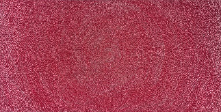 Paintings by Walpari woman Kay Rubuntja Napurrula (c.1969–2022) are finely dotted, each called Ngapa (Water Dreaming). One in red and white forms a detailed spiralling vortex that compels the eye.