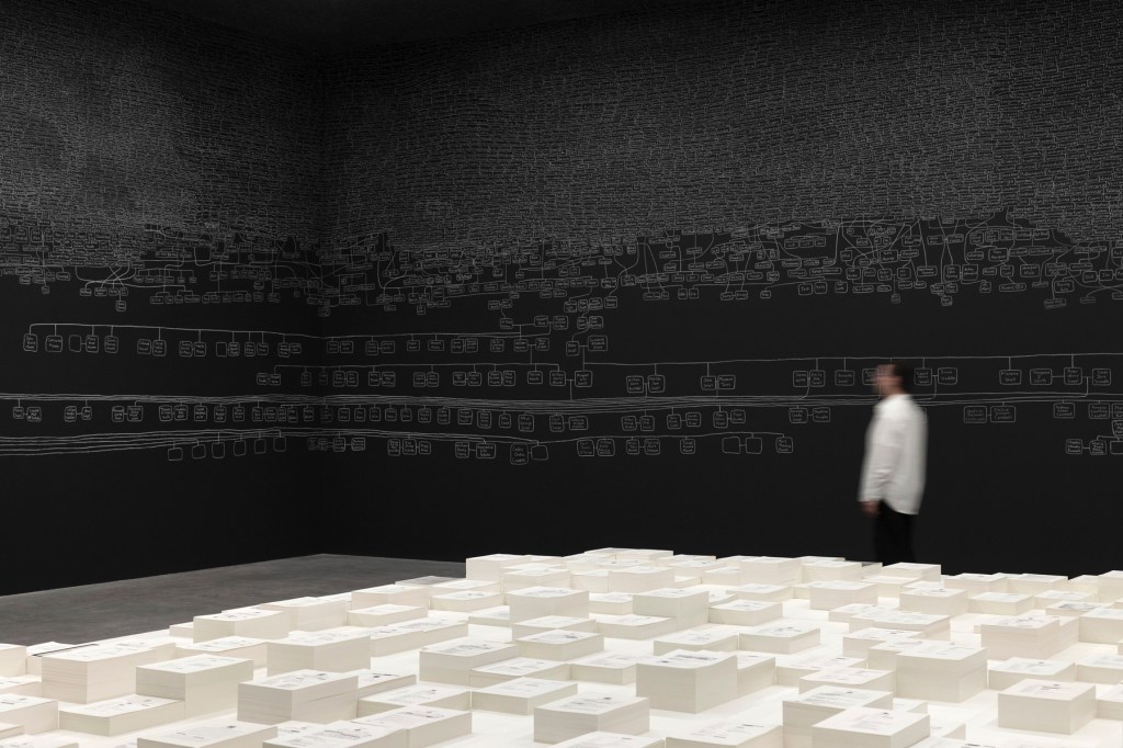 “Over several weeks , Archie and a team of installers have meticulously hand-drawn this ancestral map in chalk across a large expanse of four walls in a stand-alone room specially built to replicate the internal dimensions of the Australian Pavilion in Venice. The work also confronts the ongoing legacies of Australia’s colonial history and the over-incarceration of First Nations people, with a collection of coronial reports on deaths in custody suspended above a memorial pool in the centre of the room.