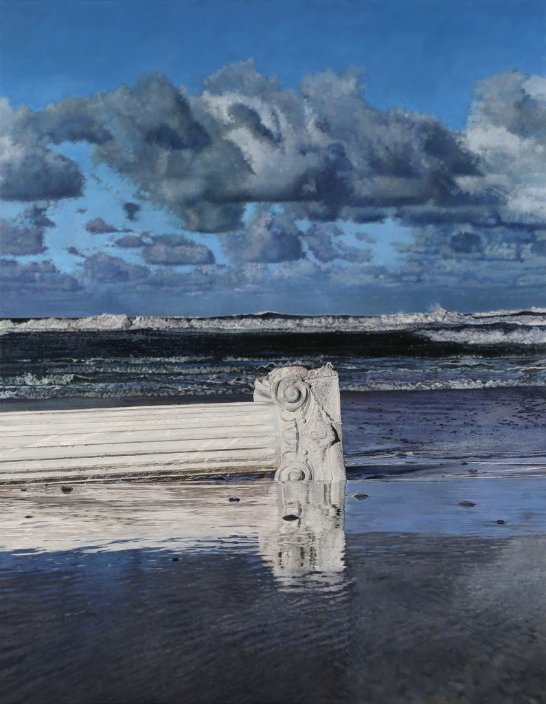 The first painting I see, however, when I enter the gallery is called Poseidon and features a fallen Ionic column on the beach, where the sky meets the sand. Zavros is a Gold Coaster originally and of Greek heritage, so both these aspects meld in this stunning work that hints at his larger themes.