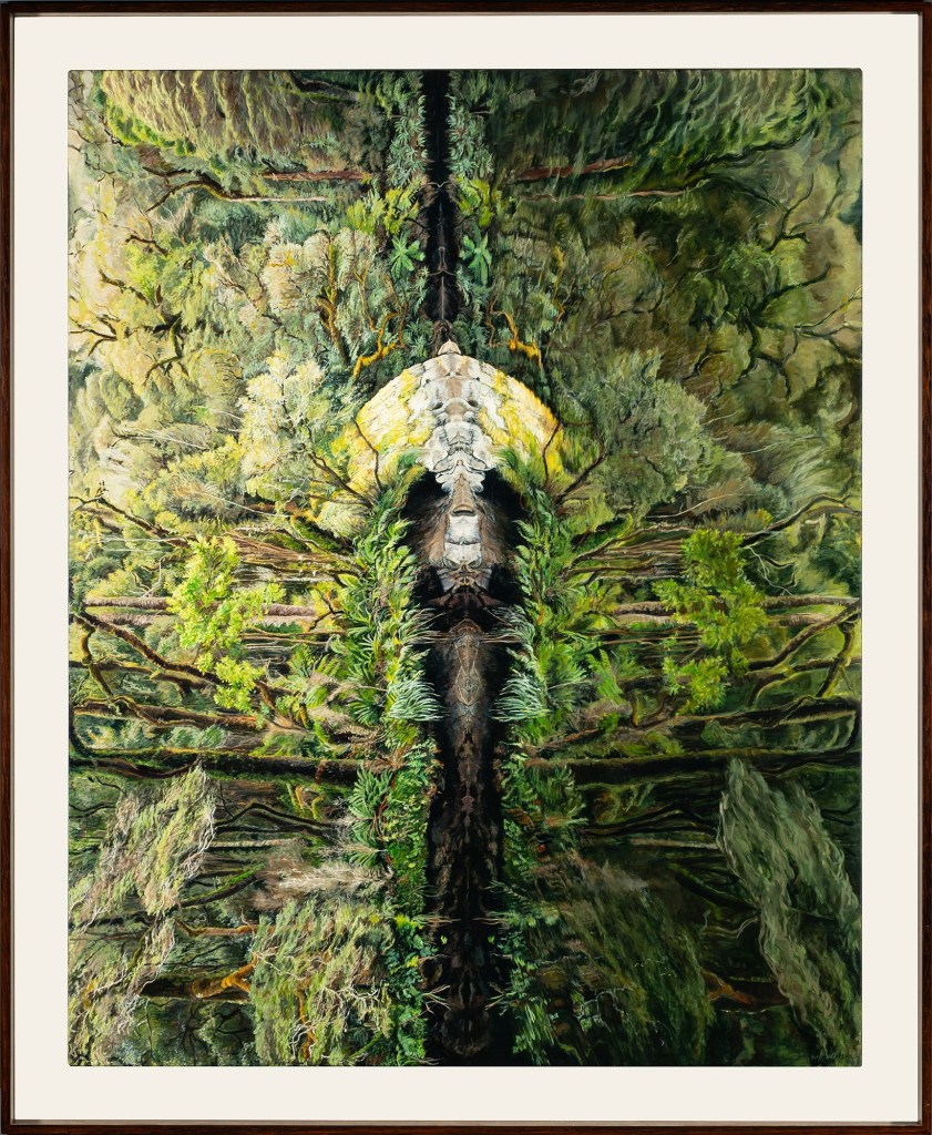 Wilson’s paintings are elemental and rich in sometimes meticulous detail, all the way down to the ferns on the forest floor.