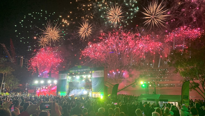Green and gold fireworks erupted from the banks of the Brisbane River after the announcement, with celebrating crowds thronging South Bank and other live sites around south-east Queensland.