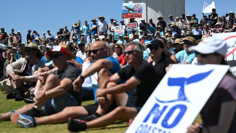 Misinformation claims such as the idea offshore windfarms kill whales appeared at this 2023 rally against offshore wind in the Illawarra region. Photo: AAP