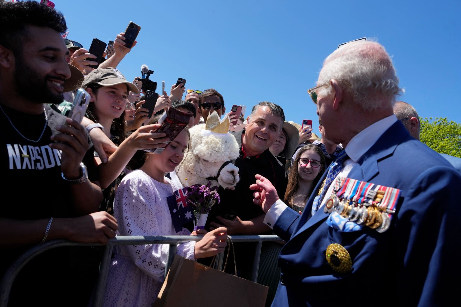 King Charles, sporting a navy suit and a bevvy of military medals, and Queen Camilla, in her white silk crepe court dress, spent more than 30 minutes shaking hands and chatting with hundreds of gathered onlookers – some wearing commemorative crowns, others offering bouquets.