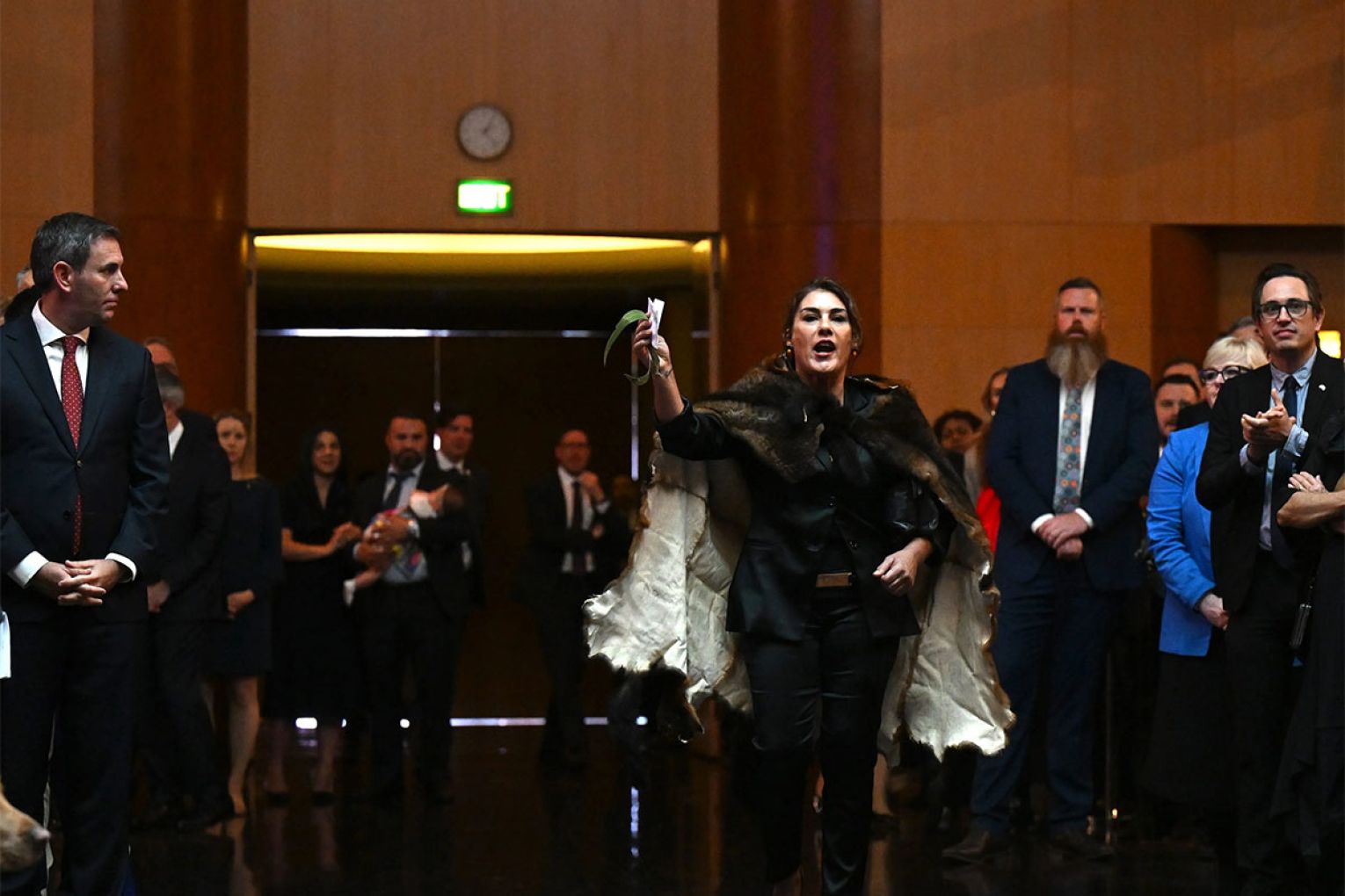 King Charles spoke quietly with Prime Minister Anthony Albanese while they sat on a podium in the Great Hall, as security officers stopped Senator Thorpe from approaching further and escorted her from the room.