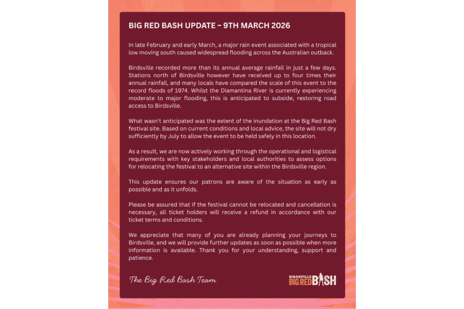 “As a result, we are now actively working through the operational and logistical requirements with key stakeholders and local authorities to assess options for relocating the festival to an alternative site within the Birdsville region.”