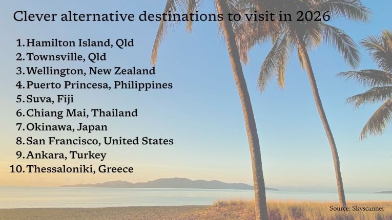 Crucially for Australians, many of the destinations in Skyscanner’s list are in the southern hemisphere or Asia. It is headed by Hamilton Island and Townsville, both in Queensland, with the New Zealand capital, Wellington, in third spot.