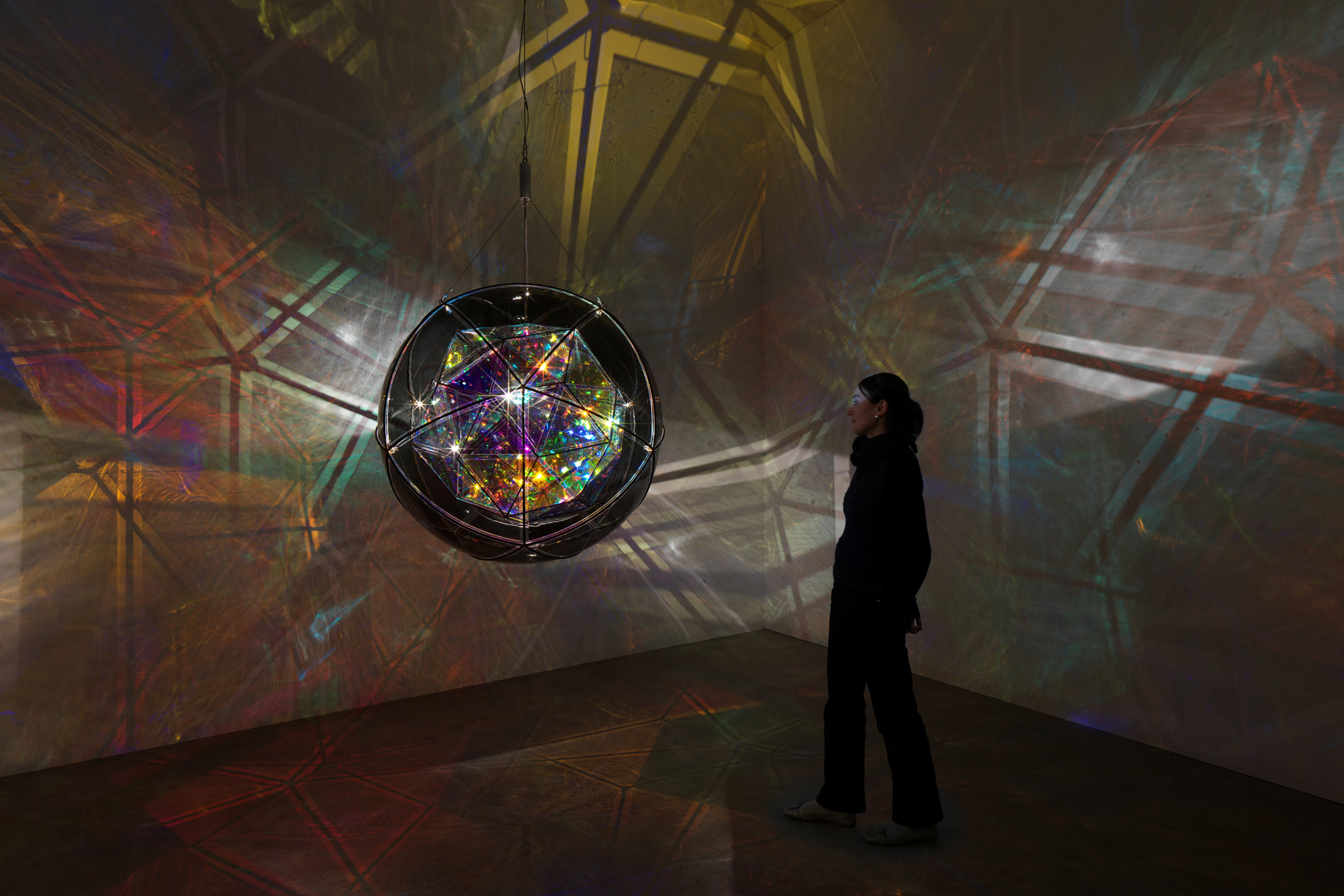 At the heart of the exhibition is Presence (2025), a newly created installation that simulates a vast, radiant sun glowing with quiet force inside the gallery. That sense of immersion continues in works like Lost compass (2013), a magnetic sculpture that hovers overhead, and the shimmering, touchable rainbow in Beauty (1993), an early piece that remains one of Olafur Eliasson’s most captivating. GOMA audiences will also recognise two much-loved interactive works – the sprawling Lego metropolis of The cubic structural evolution project (2004) and the dramatic, stone-strewn landscape of Riverbed (2014).