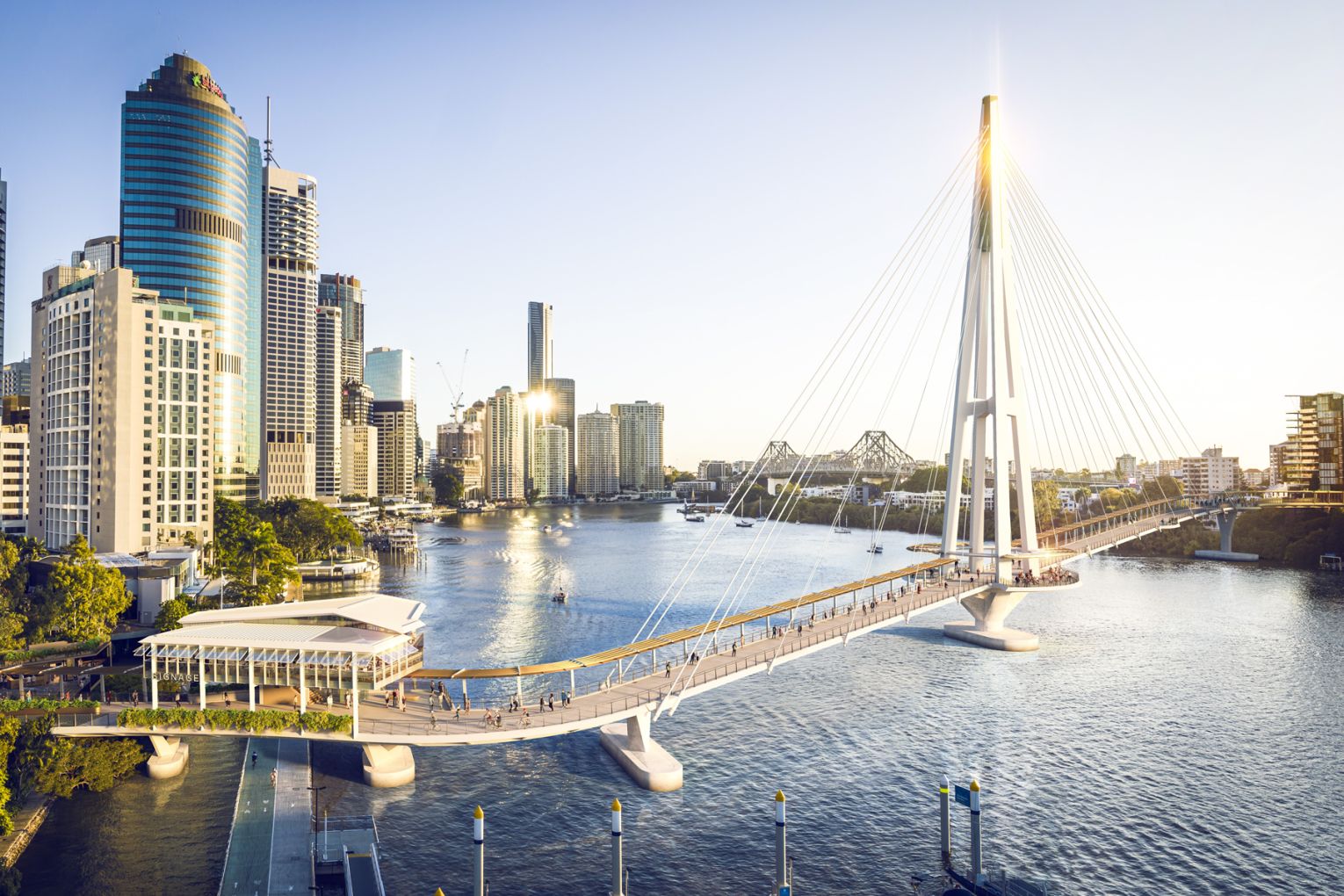 The Kangaroo Point Bridge boasts a sleek single-mast suspension-cable design that incorporate solar panels, cooling vegetation and shade cover. It also features dedicated cycle and pedestrian paths, as well as viewing platforms and rest nodes providing panoramic views of the river and city skyline. The bridge will also be home to two new unique dining options from Tassis Group, including above-water restaurant and bar Stilts and riverside cafe Mulga Bill’s. These venues are expected to open early in the new year – stay tuned for updates on these in the coming weeks.