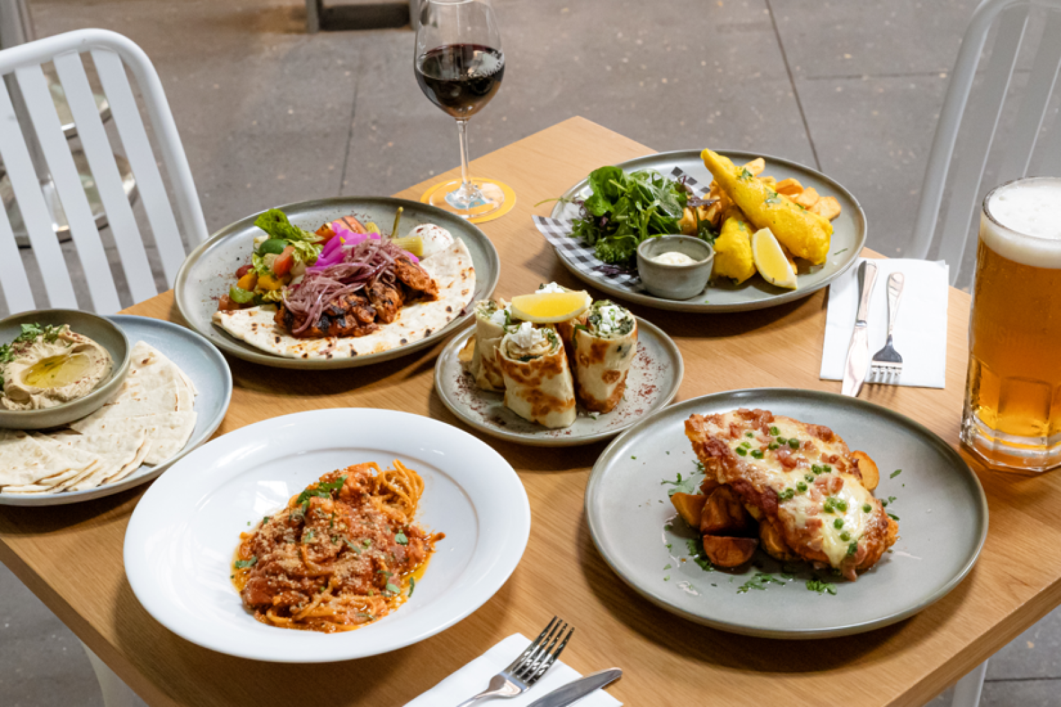 Little Miss Sunshine is a light-filled 250-seat bistro and microbrewery from RMS Group, the team behind fellow inner-city locales Hellcat Maggie, Isles Lane and Fig & Olive. Nestled at the rear of the Heritage Lanes on Ann Street, Little Miss Sunshine embodies the best bits of Queensland, from the killer climate and carefree lifestyle to our world-class produce. Little Miss Sunshine reflects the state’s sun-soaked scenery via a fit-out mixing warm timbers and sturdy brick, with terrazzo stone tops and bumblebee-yellow leather booths giving off a warm and approachable vibe. The venue is equipped with a bar (boasting 28 taps), a fully equipped kitchen (overseen by head chef Ferdinand Sari, formerly of Babylon Brisbane), an alfresco space (for leisurely afternoon catch-ups), a private-dining space and a mezzanine level. Little Miss Sunshine is a bistro first, brewery second, with a lengthy menu fusing Mediterranean and Middle Eastern cuisines with a Queensland-inspired twist. Expect classics like beer-battered barramundi with chips and Moreton Bay bug spaghetti, as well as chicken cotoletta, chicken shawarma and fresh tabbouleh salad. As for the beer, Little Miss Sunshine’s nanobrewery produces a clutch of brews that you’ll only be able to enjoy on site, poured alongside other Queensland-made craft beers and mainstream favourites.