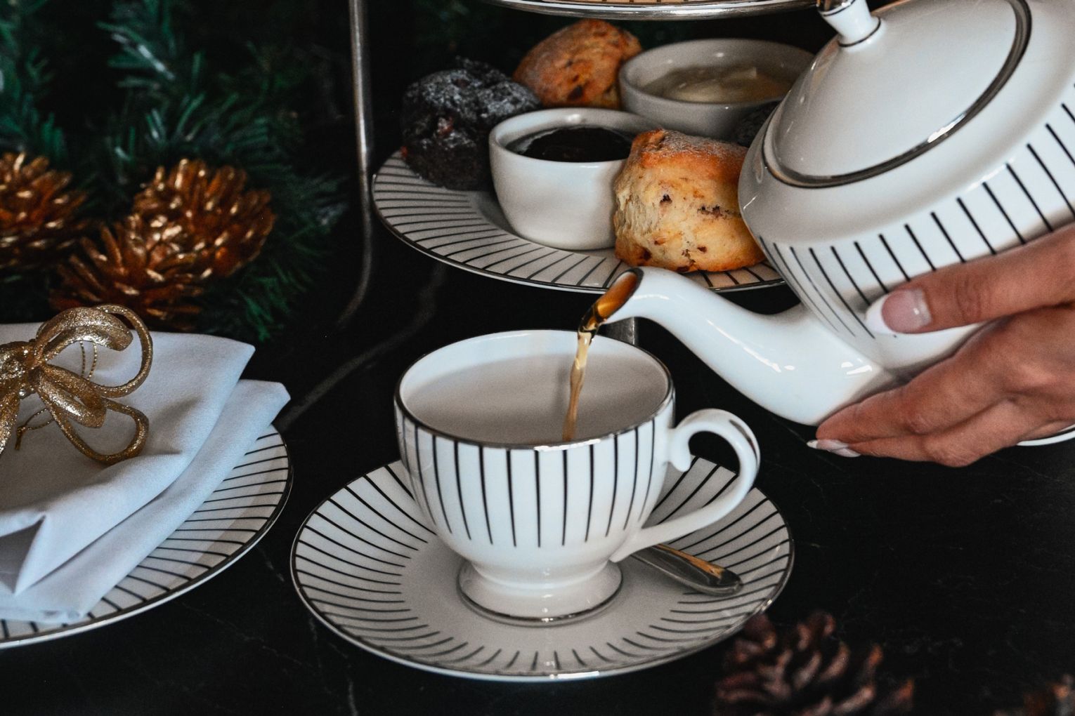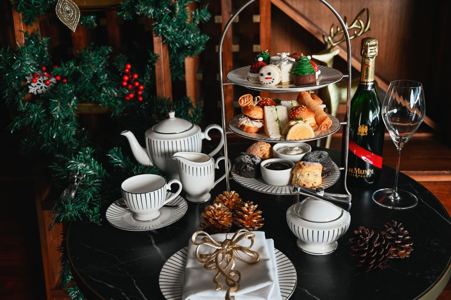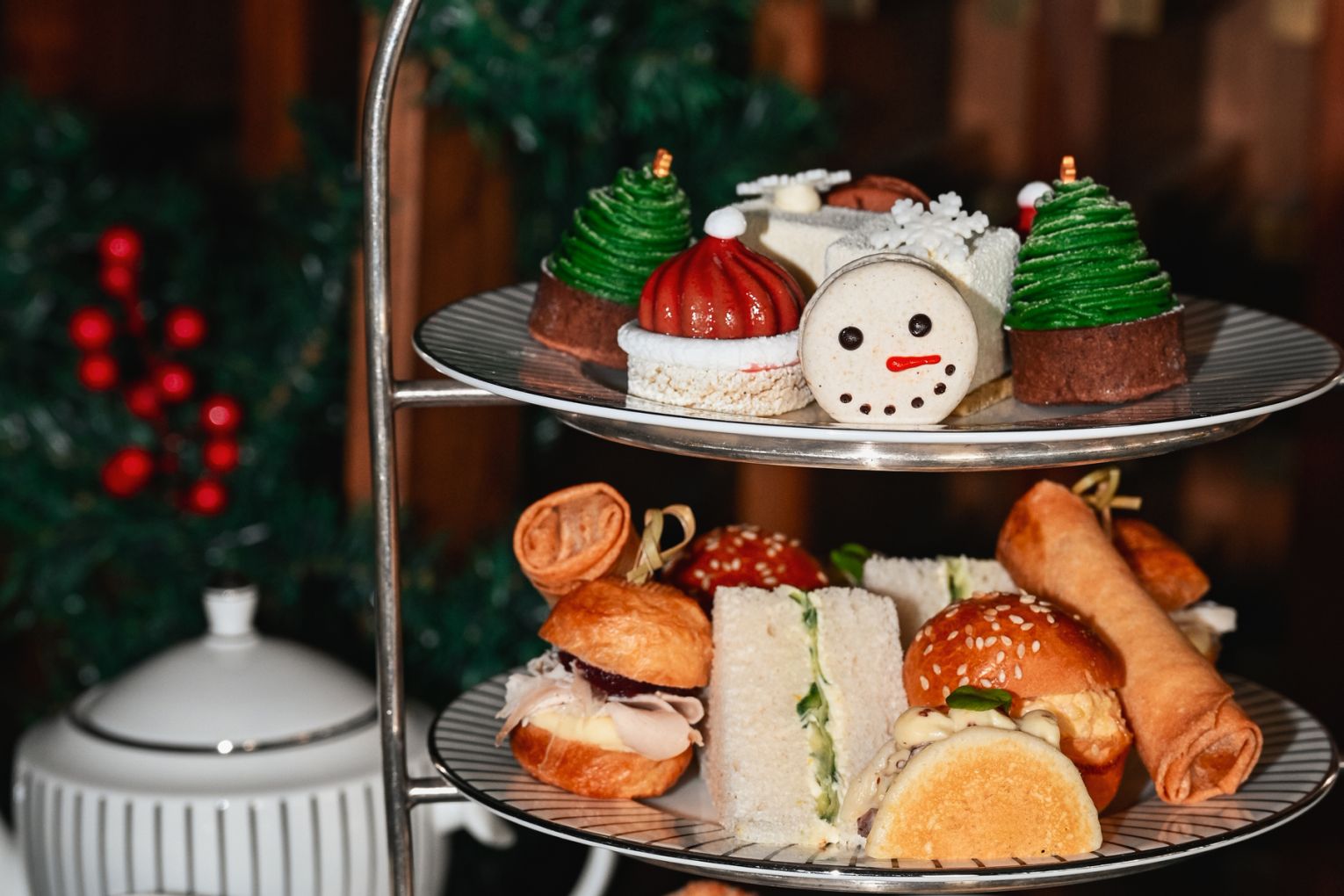 The menu is brimming with festive holiday flair, featuring Christmas turkey sliders on soft croissant buns, prawn cocktail brioches with mango aioli, pistachio-studded pork terrine bites, fresh garden tea sandwiches with yuzu cream cheese and crisp mini duck spring rolls. The sweet tier is just as enchanting, showcasing Christmas tree desserts crowned with green matcha vermicelle, jasmine-mango snow cubes, festive macarons, cherry-topped Santa hats and warm cranberry-cocoa scones served with jam and cream.