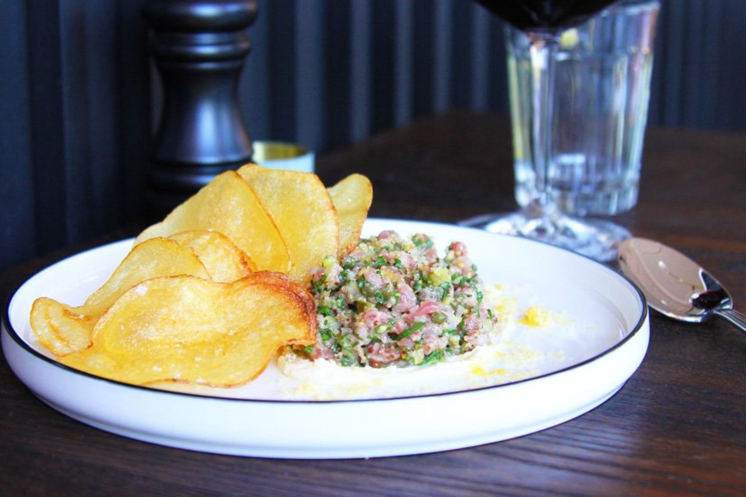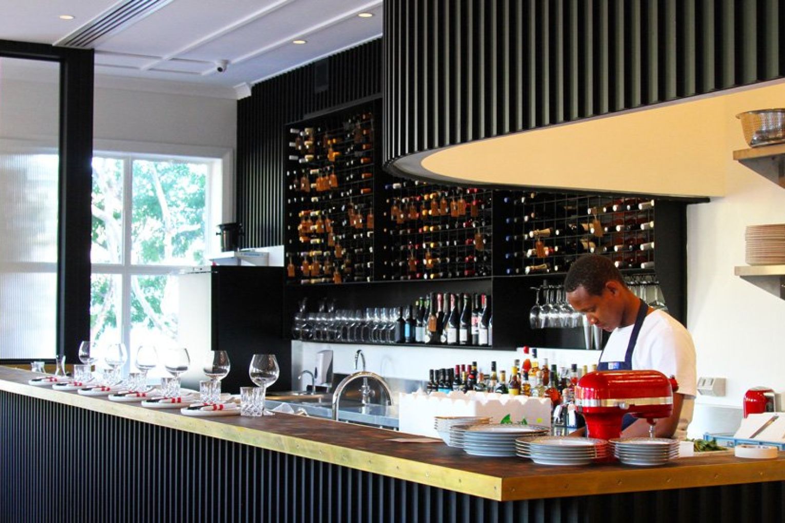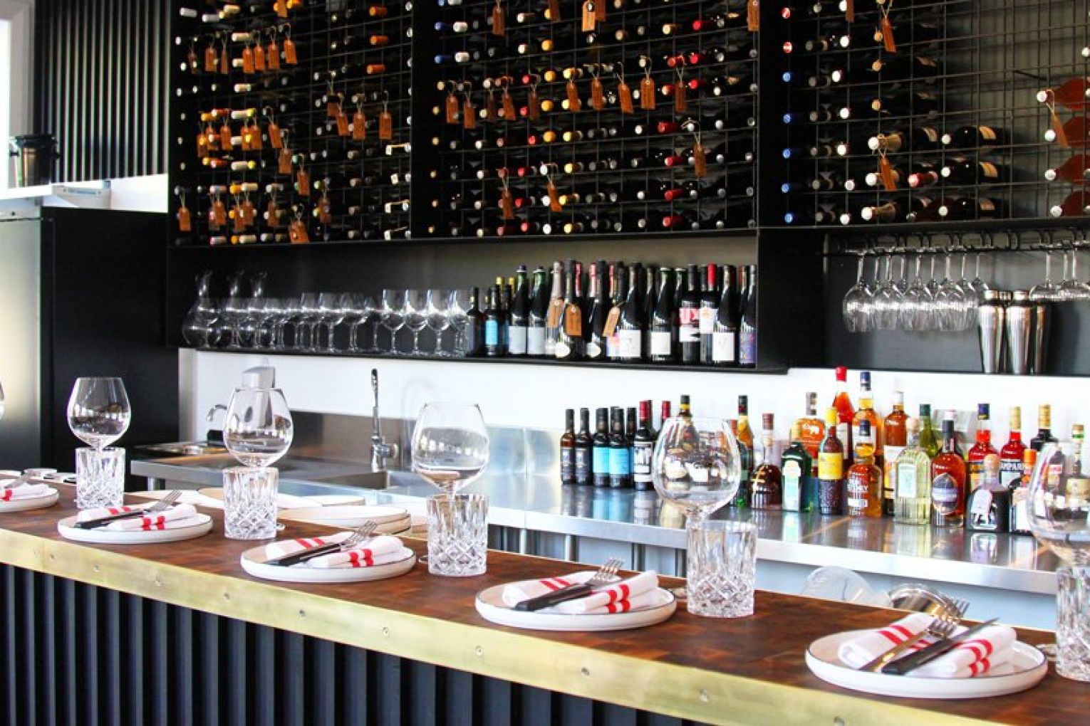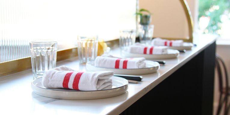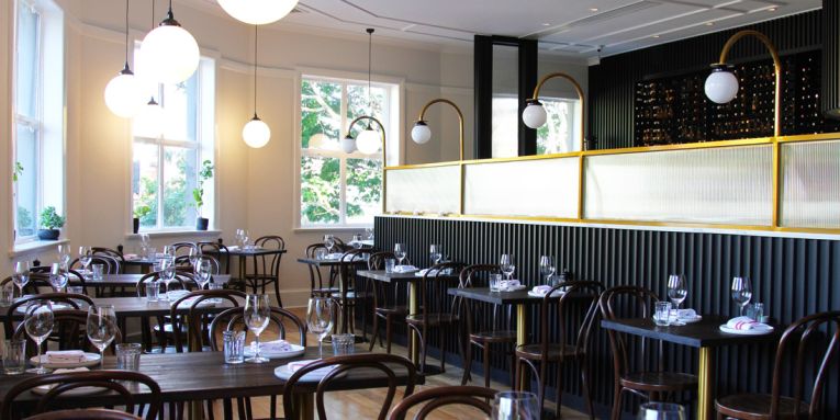 From the outside, it would be easy to walk by Maeve Wine unknowing of what lies upstairs. The curious and observant, however, will be lured by the warm glow of bulbous pendant lights shining through the double-hung first-floor windows, dying to know what awaits them behind the heritage copper door on Grey Street. The burgundy painted steps are your first clue – reading Maeve Wine Bar – your second will be the mouth-watering aromas wafting from the curved open kitchen. Maeve takes inspiration from the building’s heritage bones and classic European wine bars of yesteryear with some distinct modern touches, combining the likes of polished timber floors, black curved panelling, brass finishes and marbled benchtops. Woodsters’ Oliver Burscough is behind the fit-out, which is accented by classic bentwood chairs, red-striped linen napkins and tufts of greenery throughout the light-filled space.