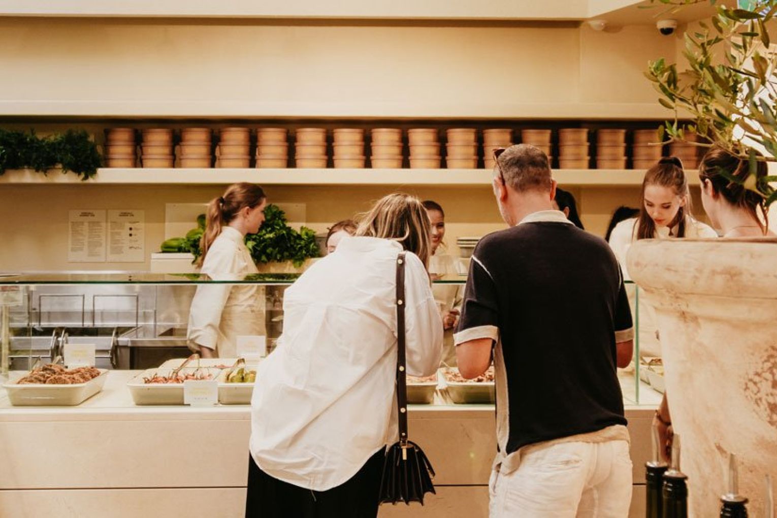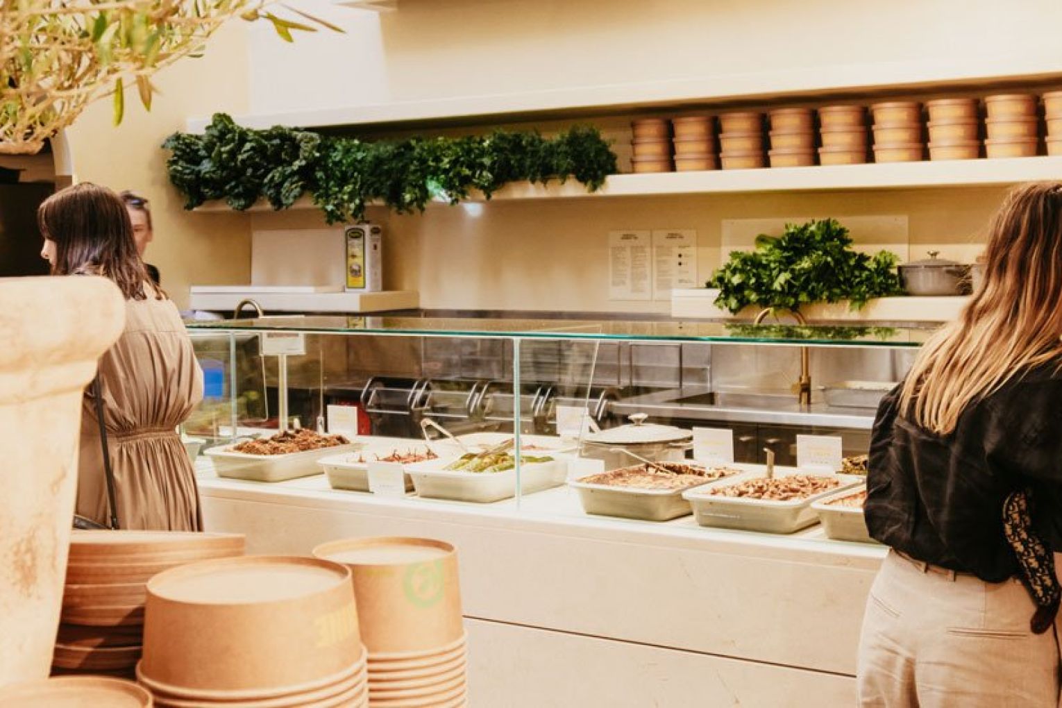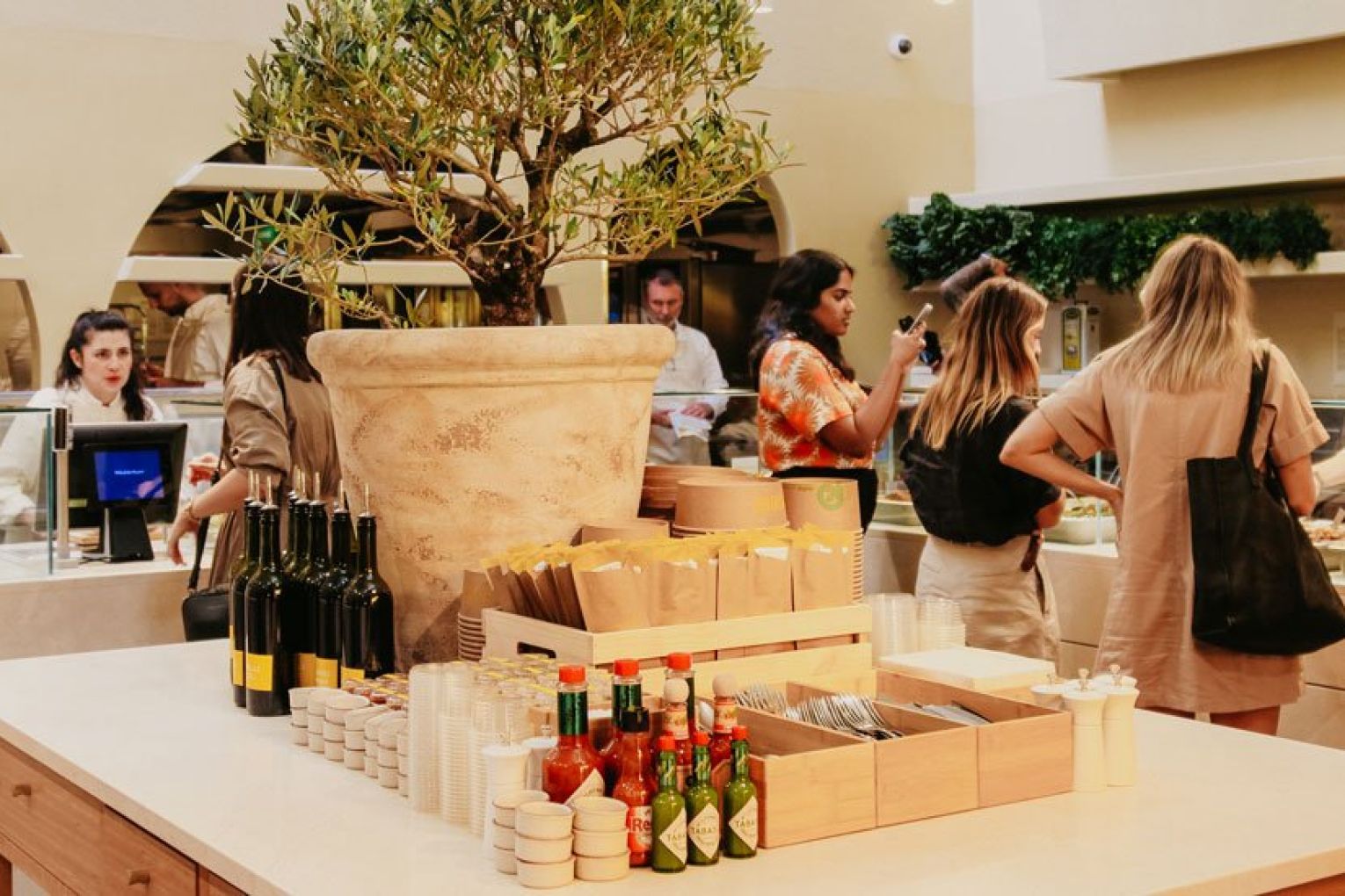 If you’re wondering what ‘point and plate’ means, we’ll happily explain the concept – but first you need to visualise the space. Once you pass the sea of yellow umbrellas, you’ll reach the timber-framed entrance of Sunshine’s interior. Featuring a neutral palette of muted tones, organic materials and curved archways, it’s a striking contrast to the vibrancy of the outdoor dining area. Your eyes will immediately be drawn upward to the high arched ceiling, where a skylight filters literal sunshine into Sunshine, illuminating the nourishing nosh awaiting your selection in the glass cabinets below. A staff member will guide you through the cabinets, then you simply ‘point’ and they ‘plate’ (told you we’d get there!) the items and quantity you want as you walk along. Once you’ve got your desired combination of delights, the staff will take it over to the counter to be weighed. Much like a deli, you pay per weight – just under $5 per 100 g, no matter what you choose. Your plate can then be packed up to take away or enjoyed outside beneath the sunbeam-coloured shades and olive trees, with an iced tea, wine or house spritz in hand. A collection of olive oils, seasonings and condiments sit atop a central island (alongside an impressive olive bonsai), ready for you to grab on your way out the door.
