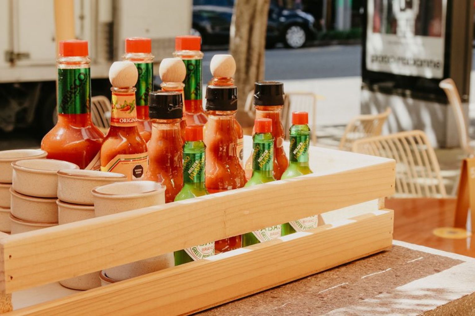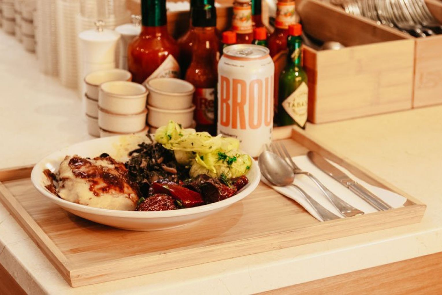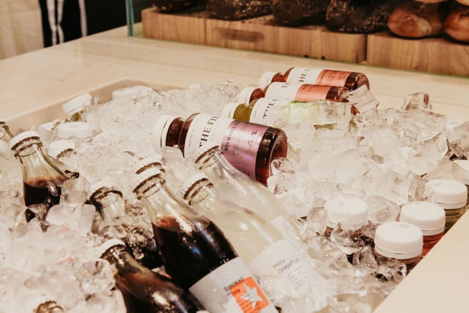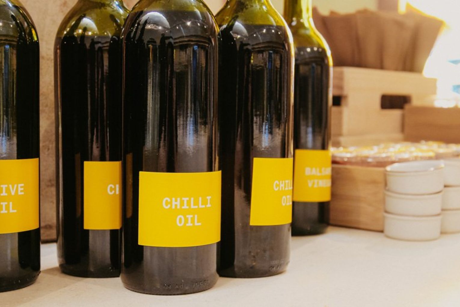 If you’re wondering what ‘point and plate’ means, we’ll happily explain the concept – but first you need to visualise the space. Once you pass the sea of yellow umbrellas, you’ll reach the timber-framed entrance of Sunshine’s interior. Featuring a neutral palette of muted tones, organic materials and curved archways, it’s a striking contrast to the vibrancy of the outdoor dining area. Your eyes will immediately be drawn upward to the high arched ceiling, where a skylight filters literal sunshine into Sunshine, illuminating the nourishing nosh awaiting your selection in the glass cabinets below. A staff member will guide you through the cabinets, then you simply ‘point’ and they ‘plate’ (told you we’d get there!) the items and quantity you want as you walk along. Once you’ve got your desired combination of delights, the staff will take it over to the counter to be weighed. Much like a deli, you pay per weight – just under $5 per 100 g, no matter what you choose. Your plate can then be packed up to take away or enjoyed outside beneath the sunbeam-coloured shades and olive trees, with an iced tea, wine or house spritz in hand. A collection of olive oils, seasonings and condiments sit atop a central island (alongside an impressive olive bonsai), ready for you to grab on your way out the door.
