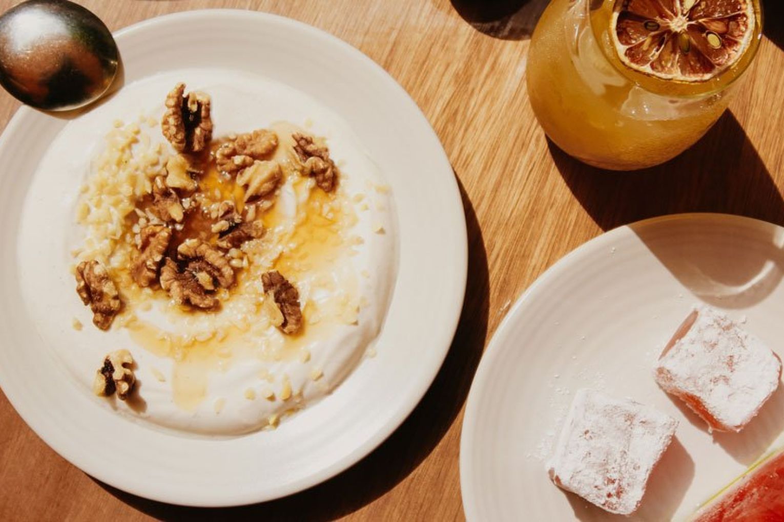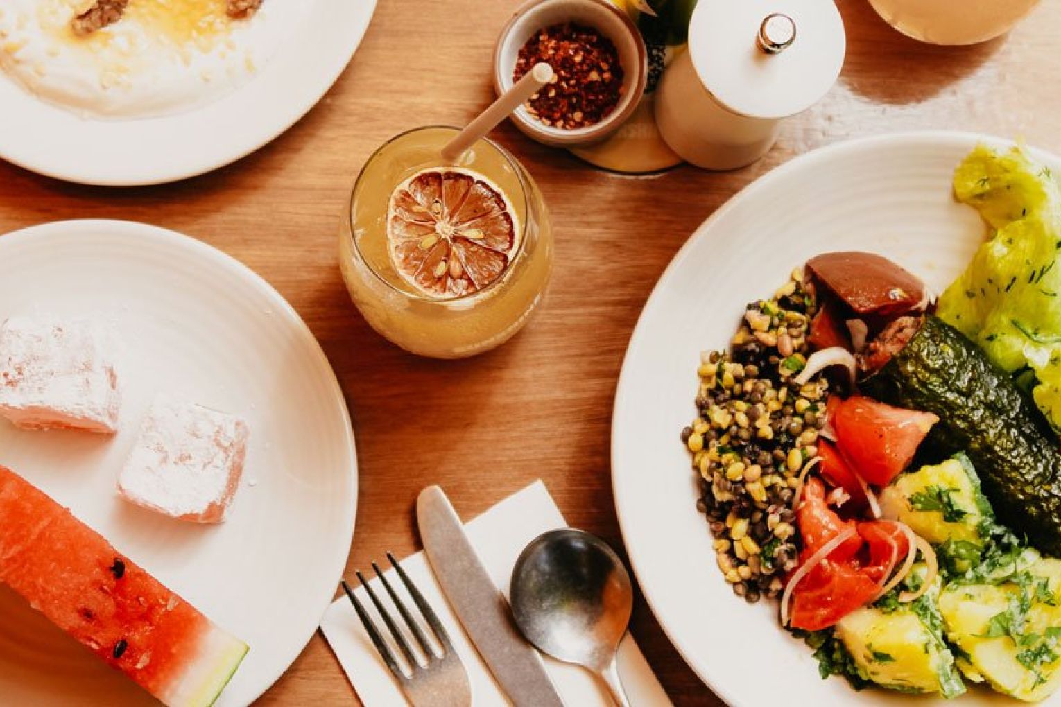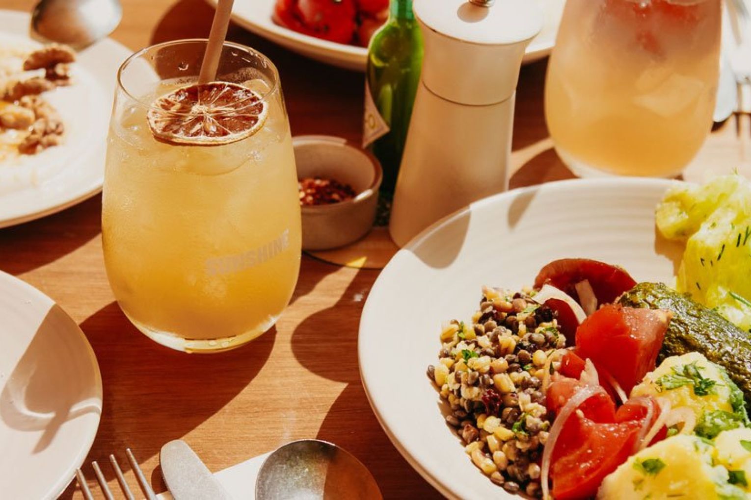 More than 30 dishes will be on rotation at Sunshine, featuring everything from hearty bakes and slow-cooked meals to light salads and delectable desserts. The eatery is a true representation of the Mediterranean diet – all of the items are nourishing, seasonal and vegetarian using only the best quality produce, with a number of vegan, gluten-free and nut-free options also available. The beauty of Sunshine is that you can choose your own adventure and craft your plate to suit your appetite, cravings and purpose. If hunger levels are high, you might opt for more substantial dishes such as spanakopita, orzo pasta, moussaka or stuffed vegetables. When you’re after something lighter, the grain salad, corn, jalapeno and chickpea salad, or broccoli with avocado might be more your speed. When you’re really craving nourishment, Simon recommends you opt for the ‘restorative greens’ – a dish similar to the Greek staple horta, which sees five different leafy greens of the day cooked down with onion, fresh tomato and olive oil to create a wholesome meal that will revitalise you from the inside, out. You can accompany your meal with a dollop of cumin-spiced yoghurt or fava dip, a spoonful of olives or a slice of bread, and select from the likes of fresh watermelon, Turkish delight and honey-drizzled vegan yoghurt to end on a sweet note. A true Mediterranean diet is not without wine and group beverage director Alex McPherson has crafted a list that favours sustainable, organic, biodynamic and vegan drops from a clutch of forward-thinking Australian wineries. These are joined by a handful of beers (both alcoholic and non) and clever cocktails, as well as juices, kombucha, whole fresh young coconuts and house-made concoctions – think old-fashioned pink lemonade and the Sunshine Mediterranean Iced Tea, which is made from traditional Greek mountain tea.
