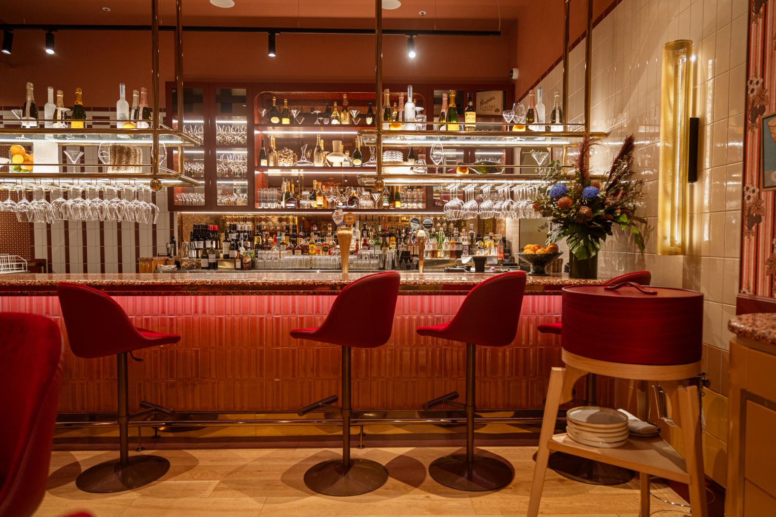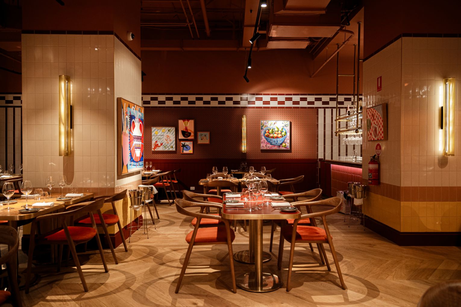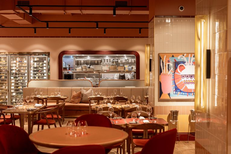 Shielded from view from the square by a curtained entrance, The Wolf’s full-service restaurant and bar might be one of the best-looking dining rooms in The City. In addition to curating the delicatessen’s aesthetic, Melissa Collison Design Studio has worked on the restaurant’s interior design and styling, drilling further into the mid-century inspirations and punching it up with an abundance of colour and texture. Even when dimly lit, the room is a sensory marvel, boasting vivid tones of paprika and saffron, cream and burgundy tiles and terrazzo, velvet-lined chairs and corduroy-encased banquettes, pendant lights, warm timber parquet floors, wallpaper from Schumacher, and a gallery’s worth of original artworks.