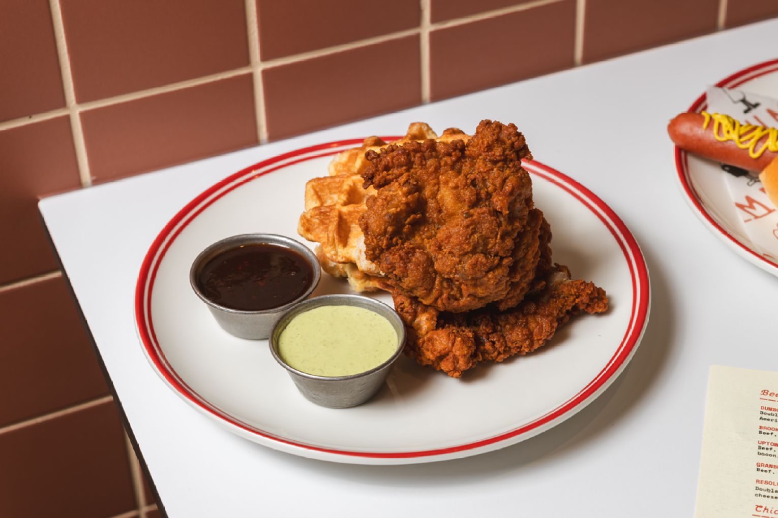 Over on the other side of the menu is DUMBO’s street-food options, which include Red Hook’s classic chicken wings, plus new items like the Dirty Water Dog (an ode to the franks served from New York’s street-side hot dog vendors), fried chicken with liège waffles, Korean hot honey and buttermilk ranch, a poppy seed bagel with smoked salmon, cream cheese, red onions, crispy capers and fresh dill, and a fried-fish sando with American cheese, house tartare and butter crunch lettuce. There are also two plant-based burgers and three salads on the menu, plus an ice-cream cookie sando.