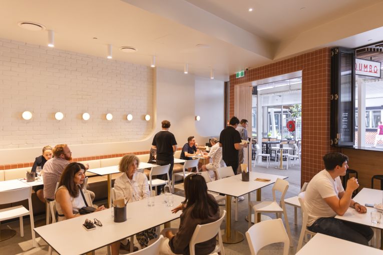 The minimalist design is pleasing on the eye, with white-brick walls, terracotta tiling, recycled timber panelling and cream-coloured furnishings creating a striking juxtaposition of colours and textures. Seating is divided between cushioned banquettes and booths, as well as freestanding tables inside and in a shielded alfresco area out front. Though different tonally, there’s still a signature characteristic that tethers DUMBO to Red Hook and the Happy Fat Group’s Newstead vinyl bar Ruby, My Dear, thanks to its hand-picked playlist of tunes and a crisp, yet charmingly casual service style.