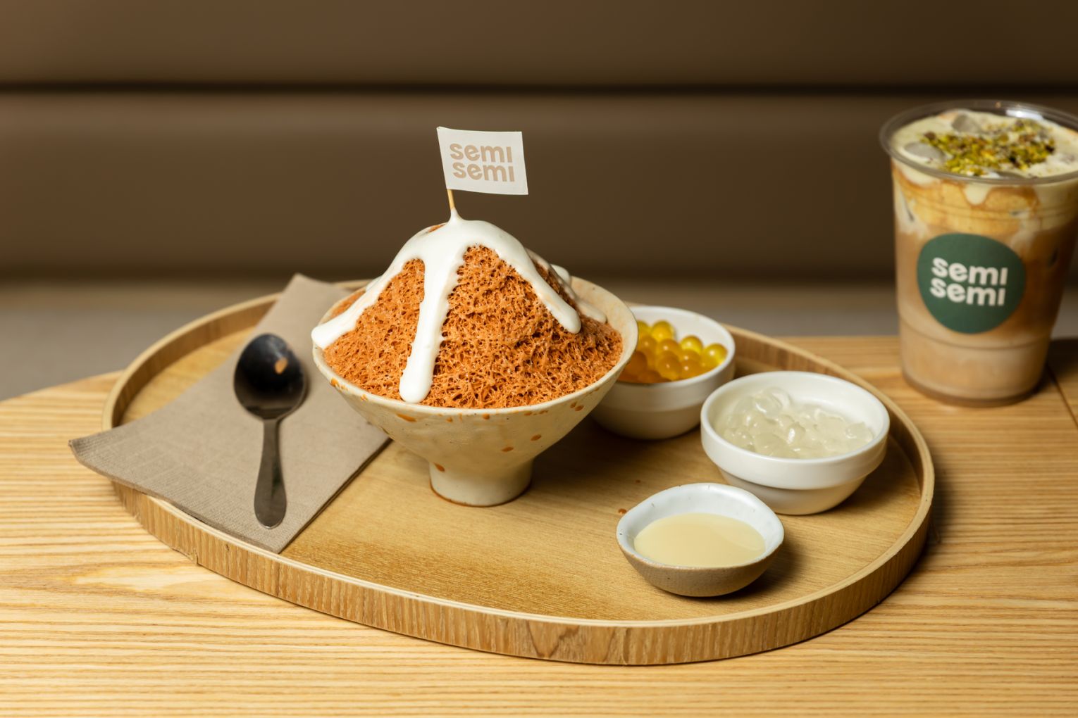 Semi Semi’s bingsu menu is stacked with a drool-worthy array of decadent options. Top sellers include the Thai Frosted Bliss (Thai milk tea-flavoured bingsu served with white pearls and mango popping pearls), the strawberry-flavoured Pink Frosted Delight (accompanied by lychee popping pearls and rainbow jelly) and the Grey Dream (Earl Grey-flavoured bingsu with white pearls and red bean).