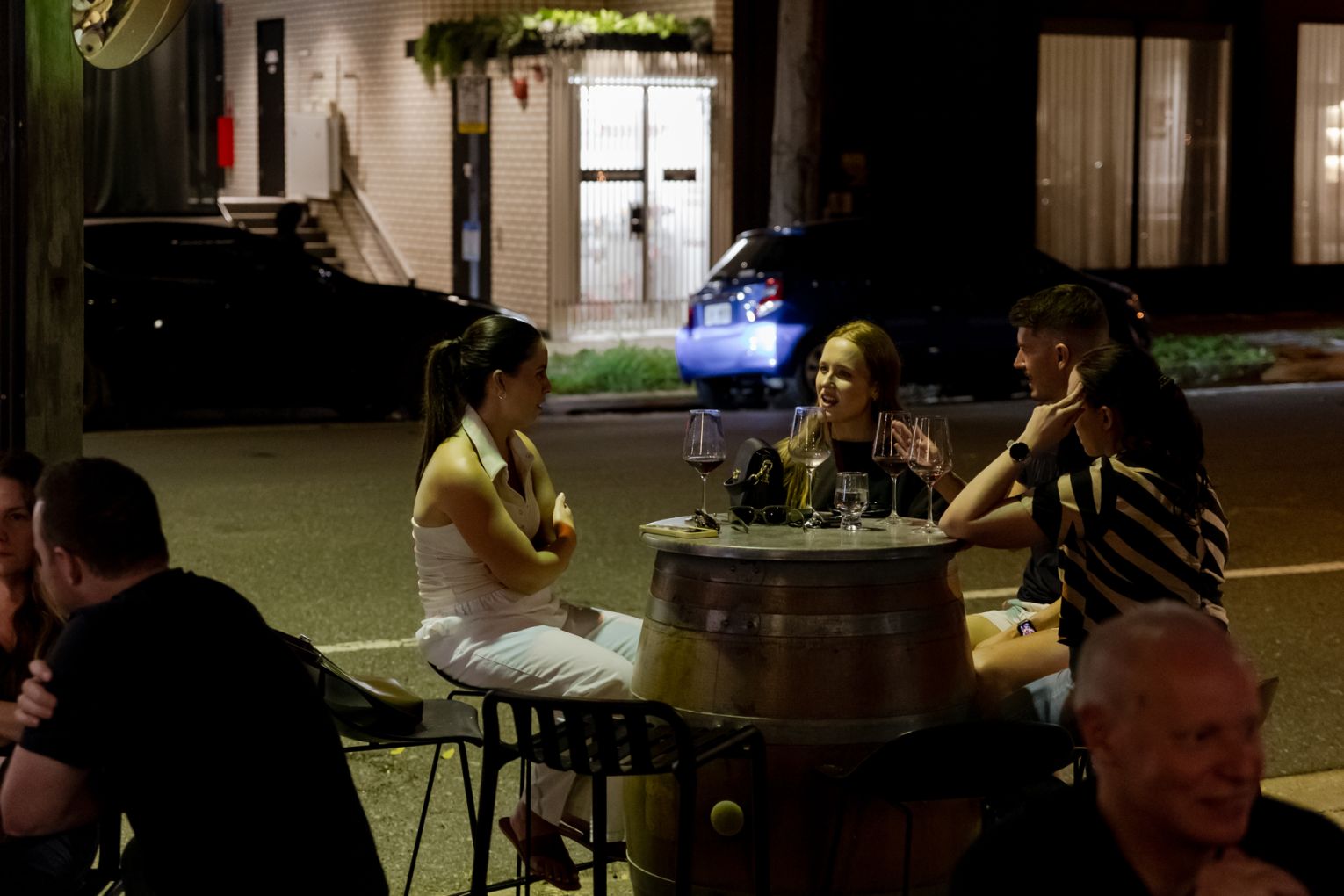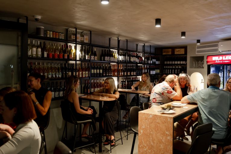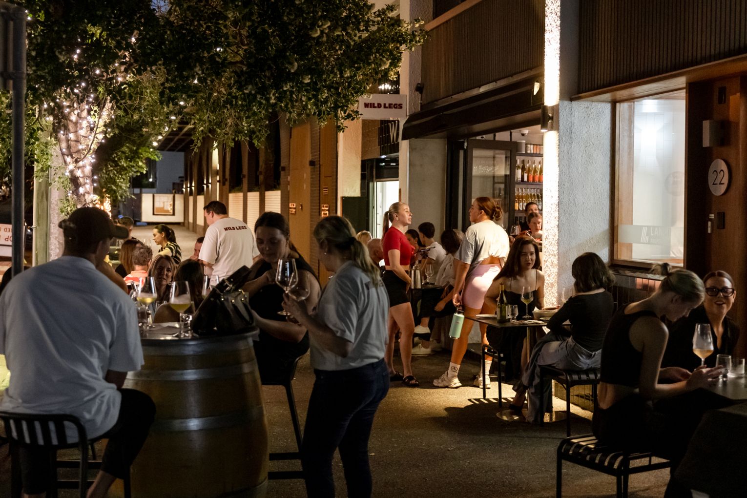Wild Legs Wine Room retains the chic bones of its predecessor (including its blush-hued marble table tops and rendered-concrete walls), with the team electing to apply only a few cosmetic adjustments. The interior – bracketed by the bar on one side and a wall-spanning shelf display on the other – is intimate, with groups rubbing shoulders around a central table and couples getting cosy in the corners. Outside, guests can savour the evening breeze while sitting at low-top tables, perched around converted timber barrels or squished in along the banquette beneath the street-facing window. Fairy light-wrapped trees gleam as the afternoon gives way to dusk, casting the venue in a magic-like glow and beckoning in wayward wine seekers.