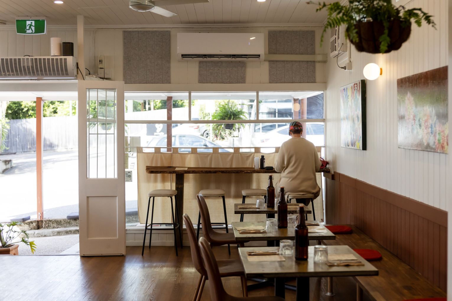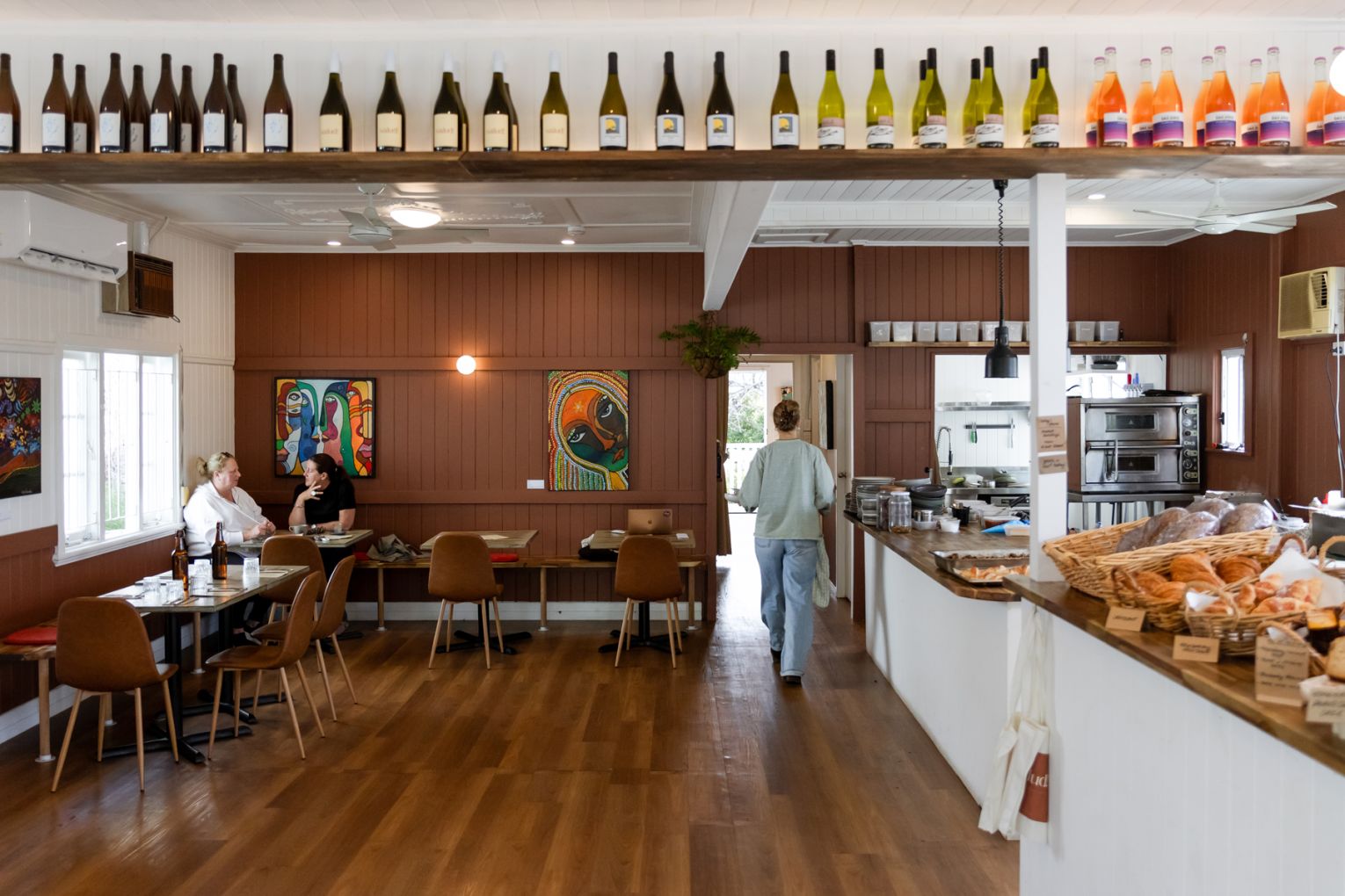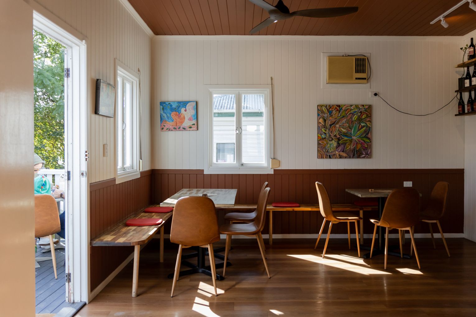 During the day, sunlight pours through the venue’s street-facing windows, bathing the interior of the converted Queenslander (previously home to a veterinary clinic) and lending extra warmth to the cafe’s earthy clay-coloured walls and original timber floors. At night, hanging lamps cast the space in a golden glow, which bounces off the glass bottles of wine arrayed along a high shelf.