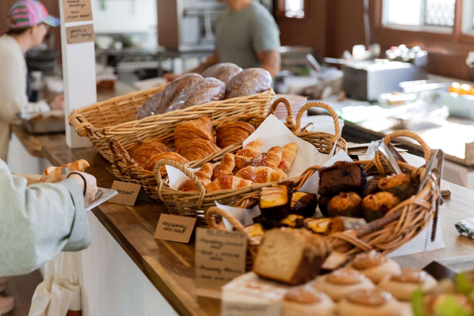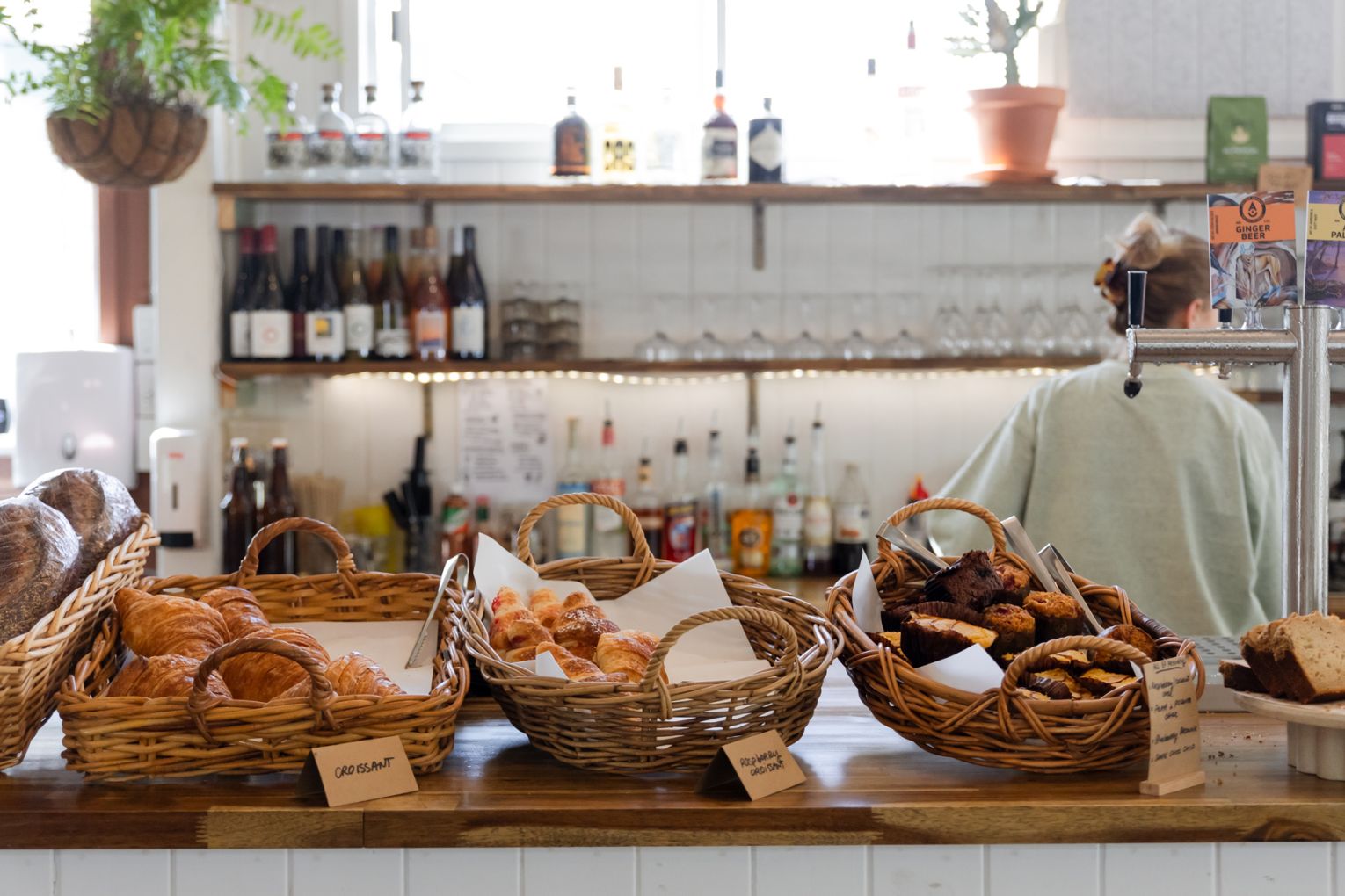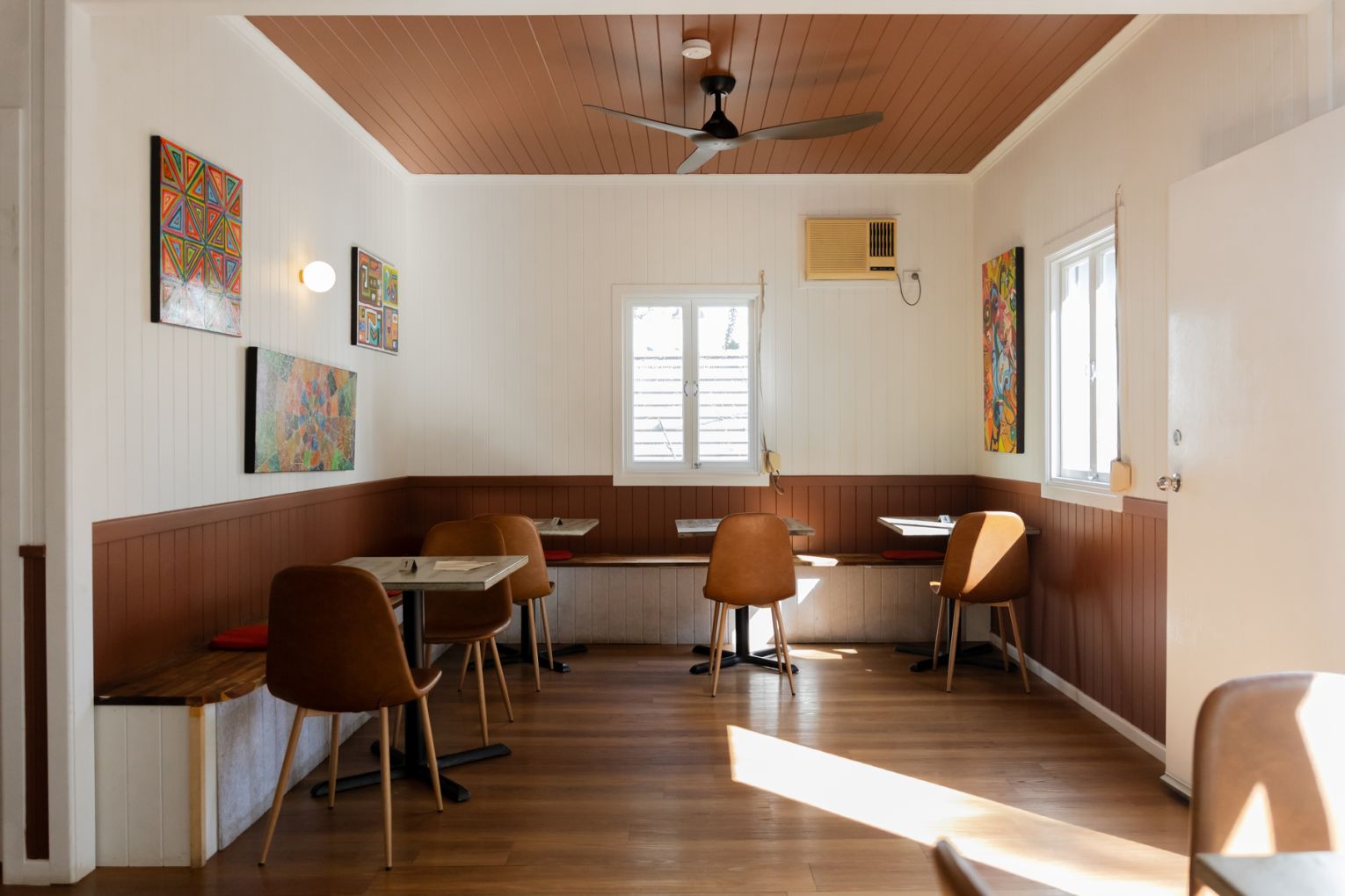 During the day, sunlight pours through the venue’s street-facing windows, bathing the interior of the converted Queenslander (previously home to a veterinary clinic) and lending extra warmth to the cafe’s earthy clay-coloured walls and original timber floors. At night, hanging lamps cast the space in a golden glow, which bounces off the glass bottles of wine arrayed along a high shelf.