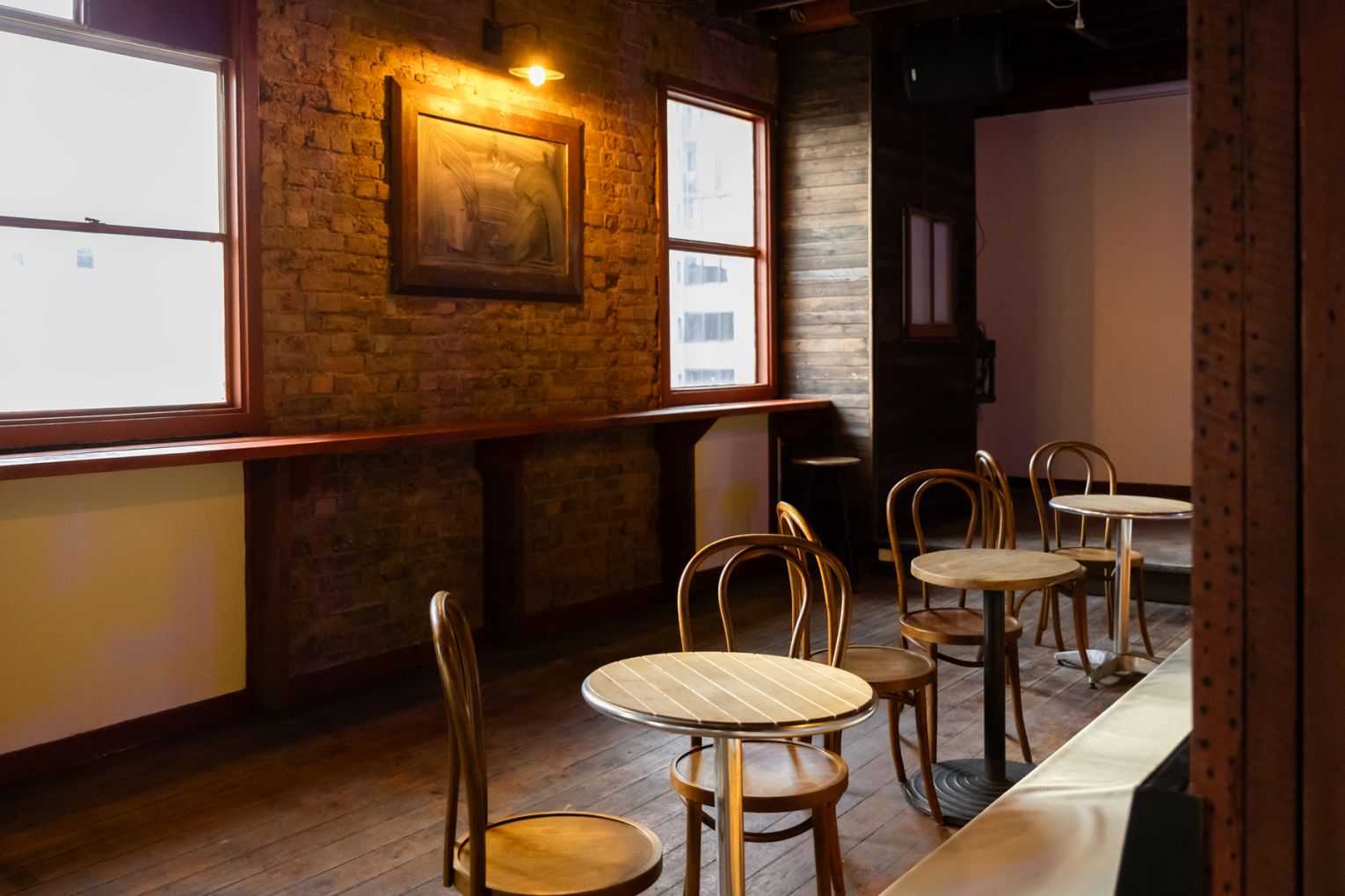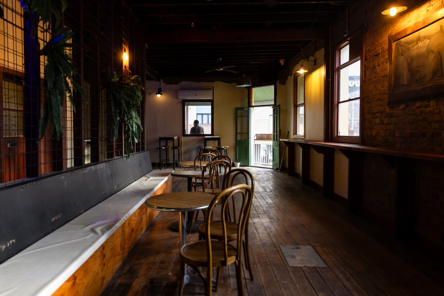Follow the hallway past the kitchen and you’ll find the back deck, with kaleidoscopic hues filtering through newly installed stained-glass windows. Upstairs is the pool room – a versatile space that will eventually be used for vinyl nights, gigs and private events (there’ll even be a pool table, once the team figures out how to fit one in through the doors).
