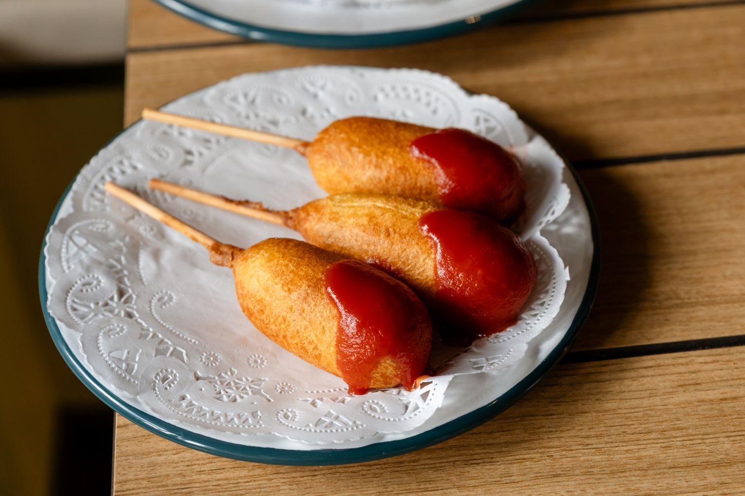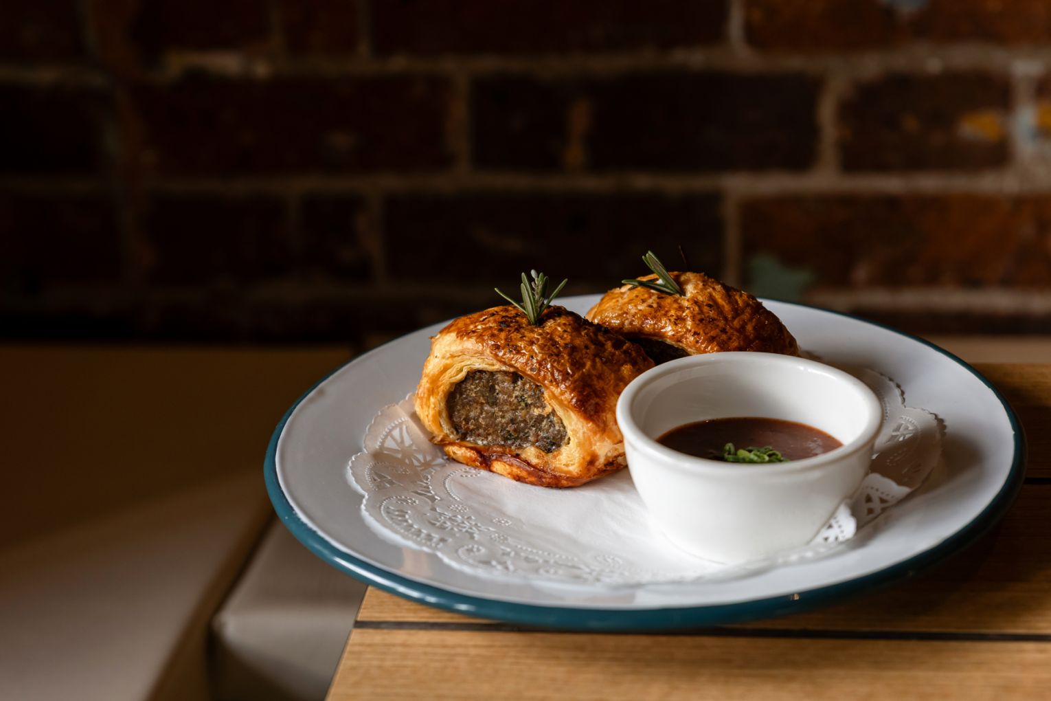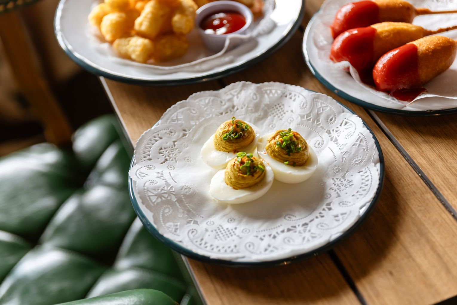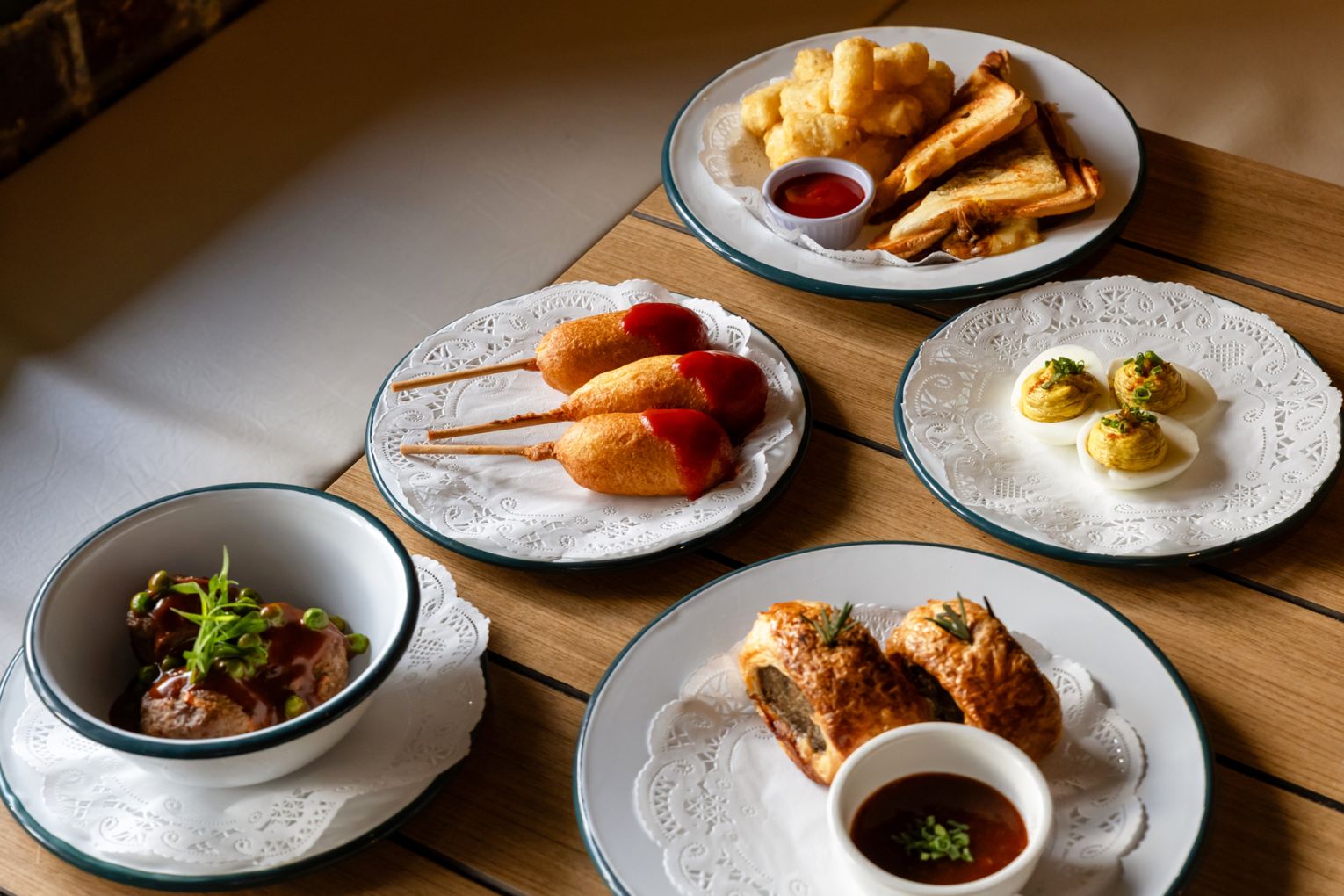 The offering starts with appetite whetters including house-baked damper with Vegemite honey butter and deviled eggs with curry and mountain-pepper mayo, before segueing into snacks like mini dagwood dogs, fried croc-and-pork dimmies, and lamb and rosemary sausage rolls.