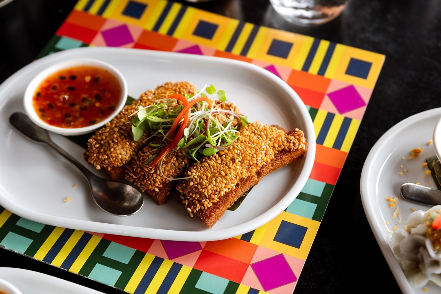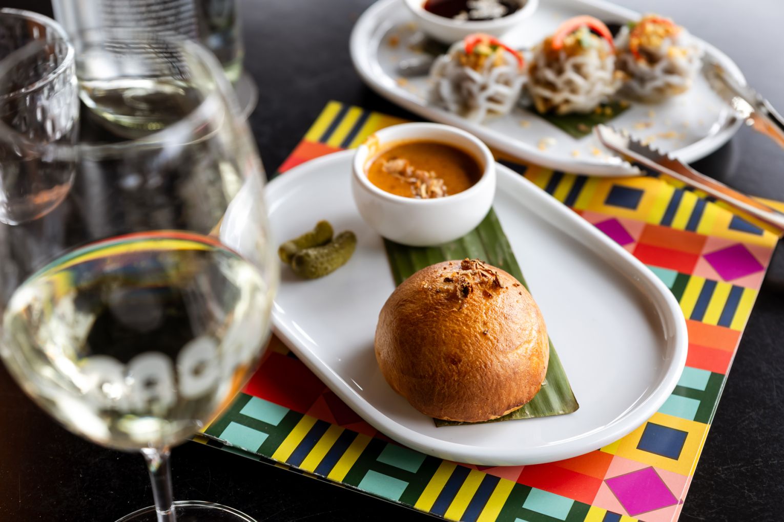 The 120-seat site, previously Aquitaine Brasserie, has been transformed via a cosmetic refresh that has removed all residue of the venue’s previous guises. Reflecting the colourful nature of Thai cuisine, Naga once again leans into the 60s and 70s aesthetic originally conjured at Eagle Street Pier by Anna Spiro. Many of the same psychedelic elements have been brought to River Quay, including the statement bookcase and paper lanterns.