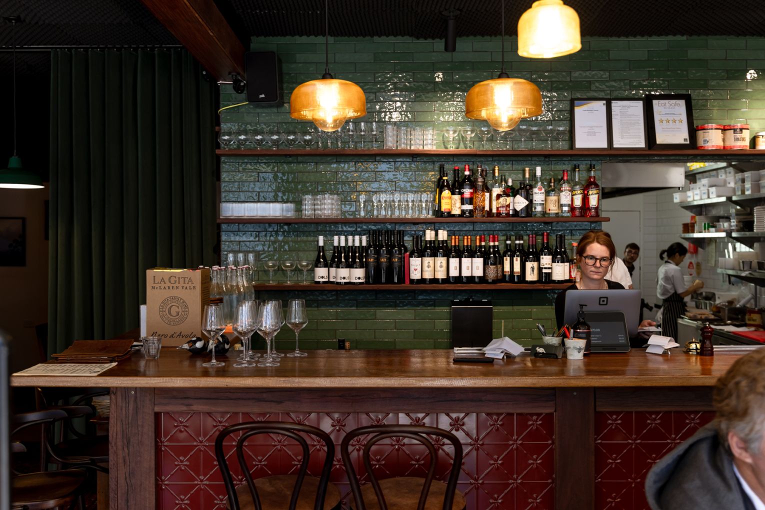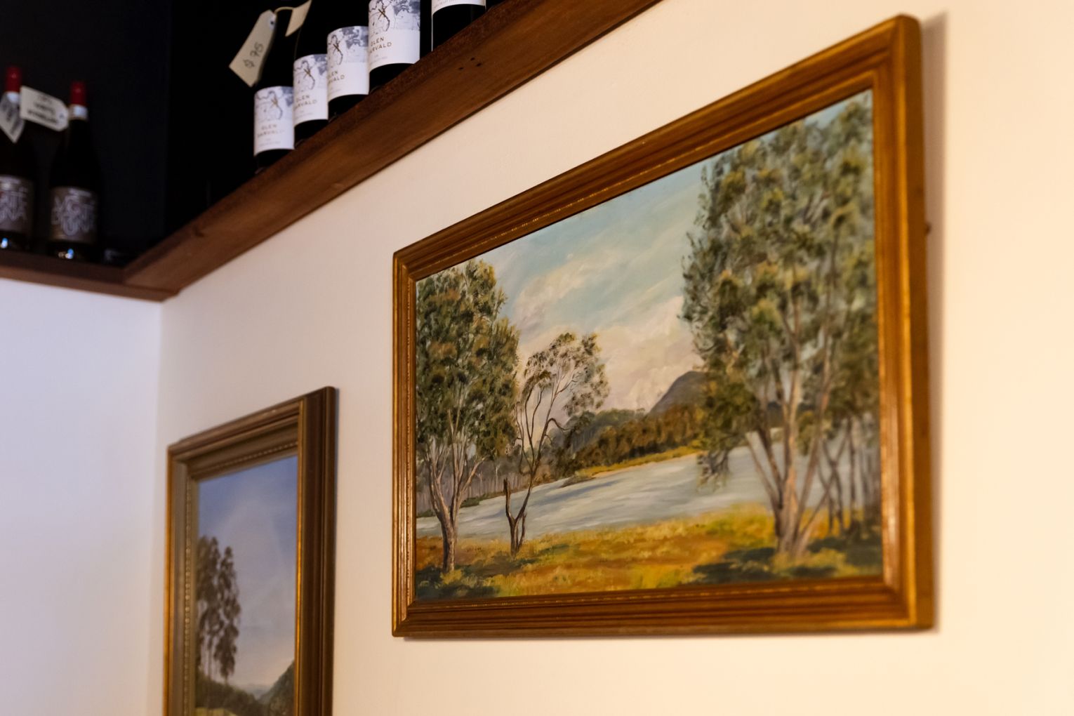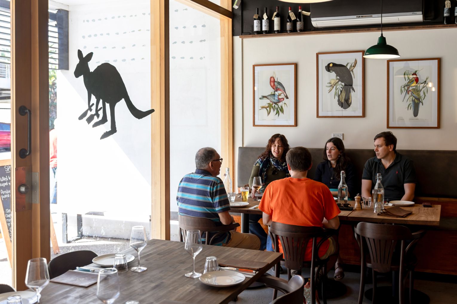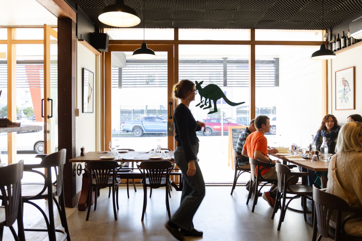 Boasting a spotted gum bar, timber beams recycled from old Queenslanders and table legs wrought from pieces repurposed from a textile factory, there’s a ruggedness that makes Wellington Road Bistro feel worn-in and comfortable. Coupled with green tiling, hand-applied gold-leaf window signage from Barker Signs, and vintage paintings of Australian landscapes and artworks from local creatives on the walls, the venue exudes character.