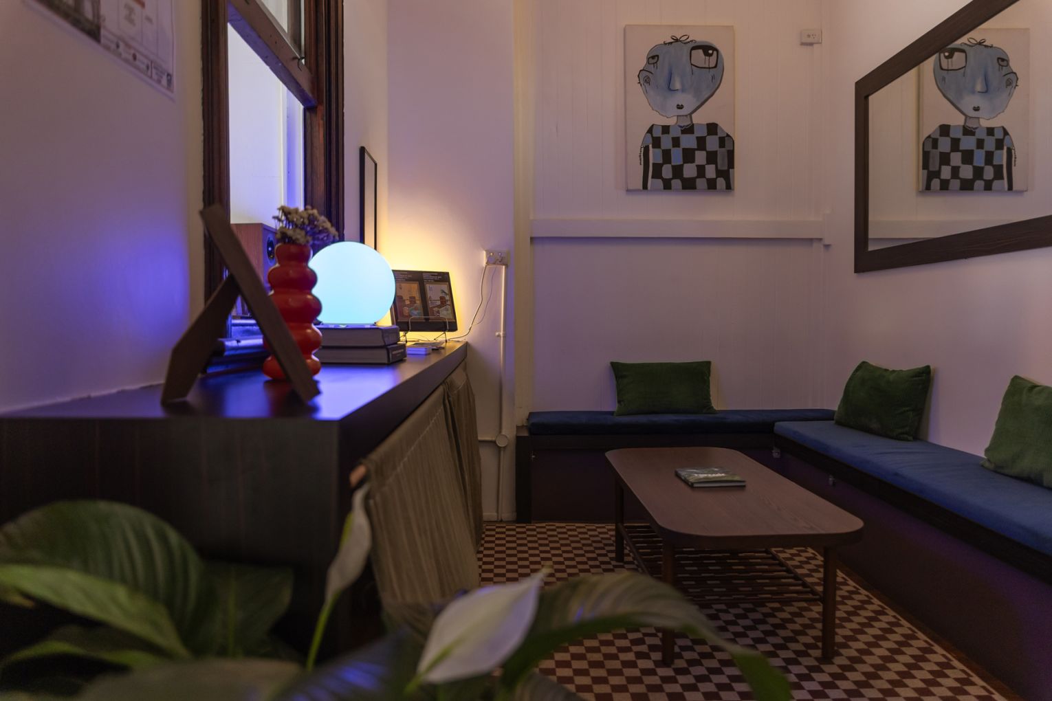The venue is divided into two compact sections – a light-filled room at the front that boasts a newly built coffee counter and a low-set timber bench for seating, as well as a relaxing lounge space in the rear illuminated by the soft glow of a blue-hued spherical lamp.
