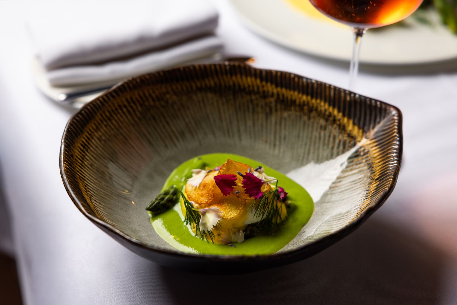 Ladle the hot veloute into warmed bowls. Using a large spoon, gently scoop the top layer of lavender foam and place it on the surface of the soup. Serve immediately with a warm seasonal asparagus tartlet, using asparagus tops on the side.