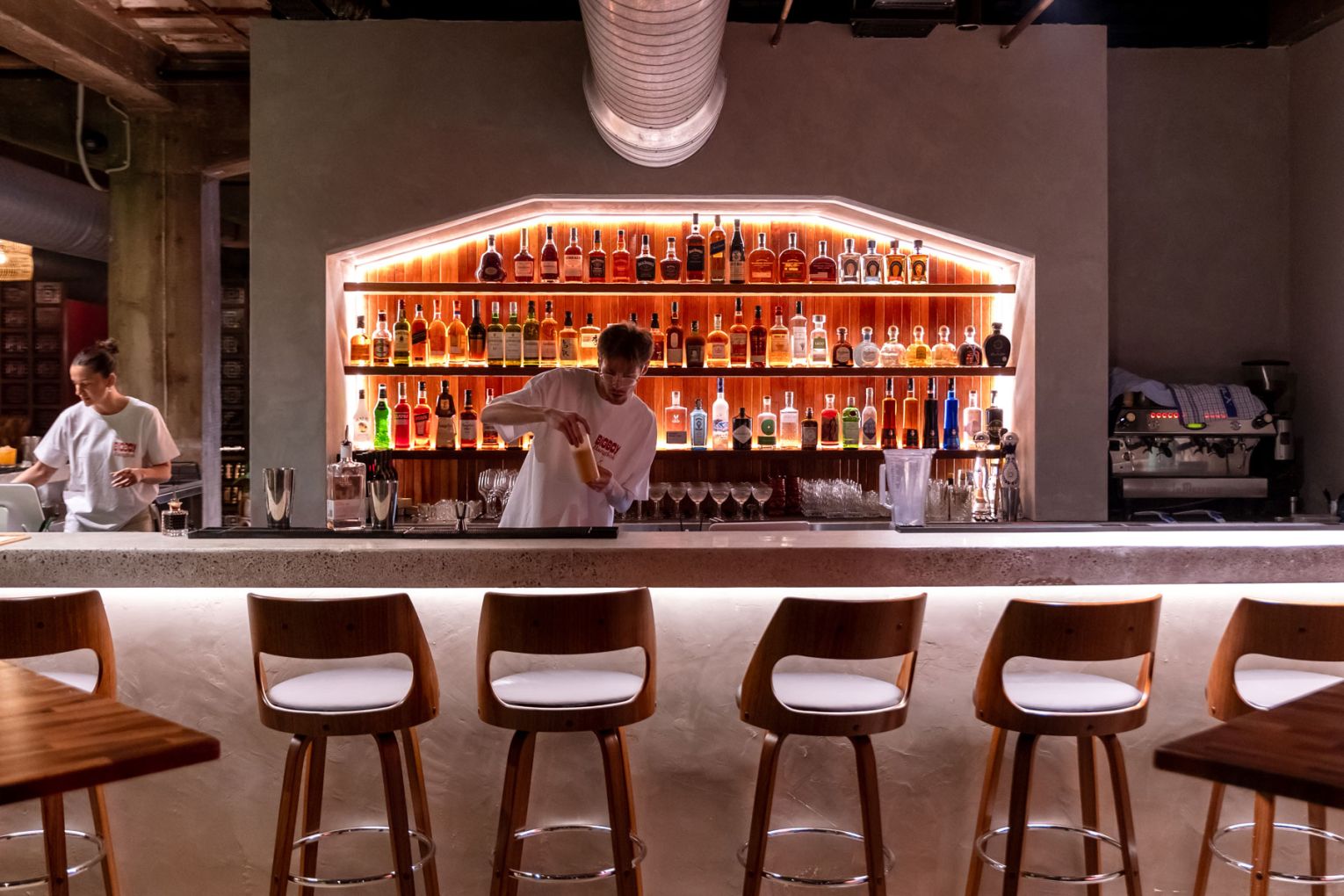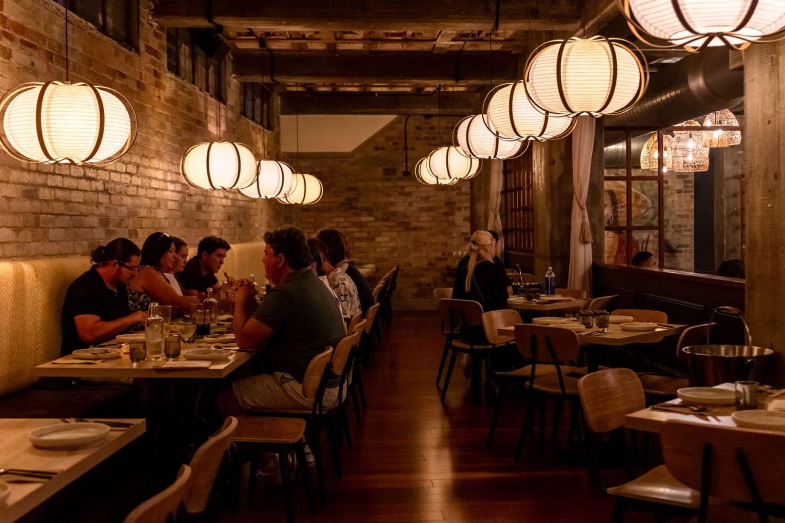 The shiny backlit bar is a natural congregation point for drinks and snacks, with high-top tables catering to the casual crowd. Meanwhile, those eager to loosen their belts for a blow-out feast can get comfy along the banquette running along the rear wall or settle in at a timber table under the wicker pendant lamps.
