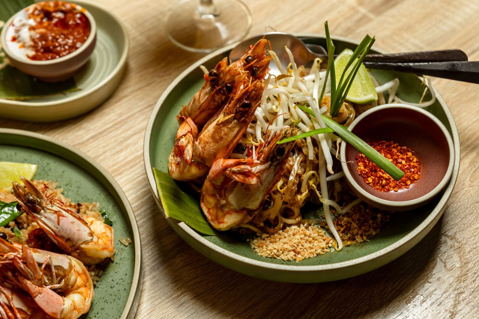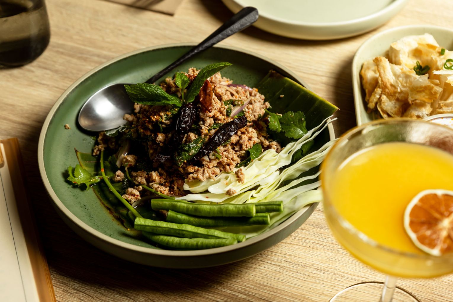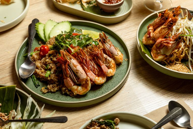 From here, portions expand with plates of fried rice with Moreton Bay bugs and spanner crab, black Angus tomahawks with Thai-style spice dry rub, and crispy fried whole fish with three-flavour sauce. Wok signatures like pad nam man ho (stir fried wagyu beef with oyster sauce) and chicken pad see ew are joined by quintessential Thai curries, including kaeng keow wan kai (Bangkok-style green chicken curry with Thai eggplant) and kaeng dang ped (fragrant red duck coconut curry).