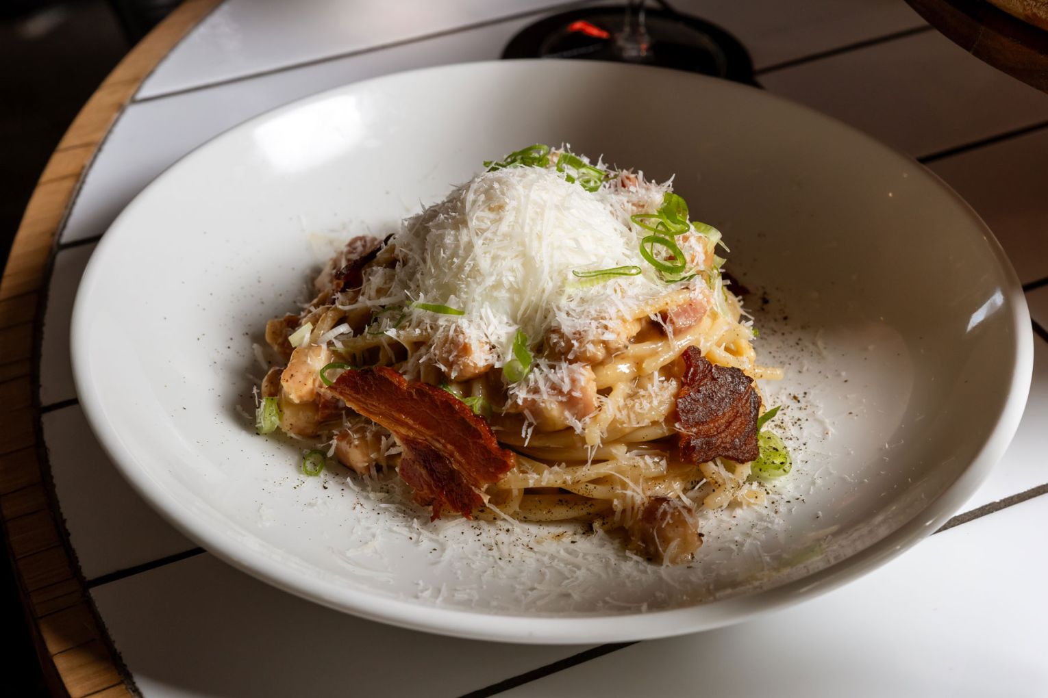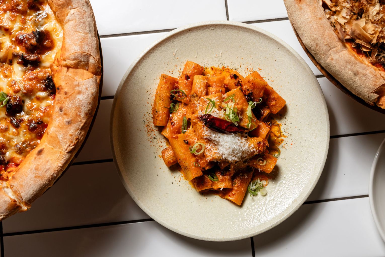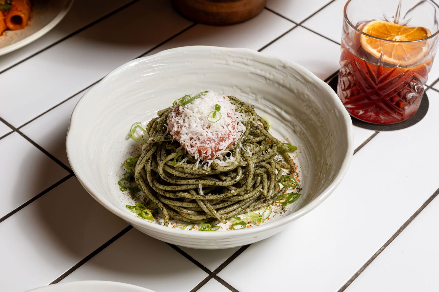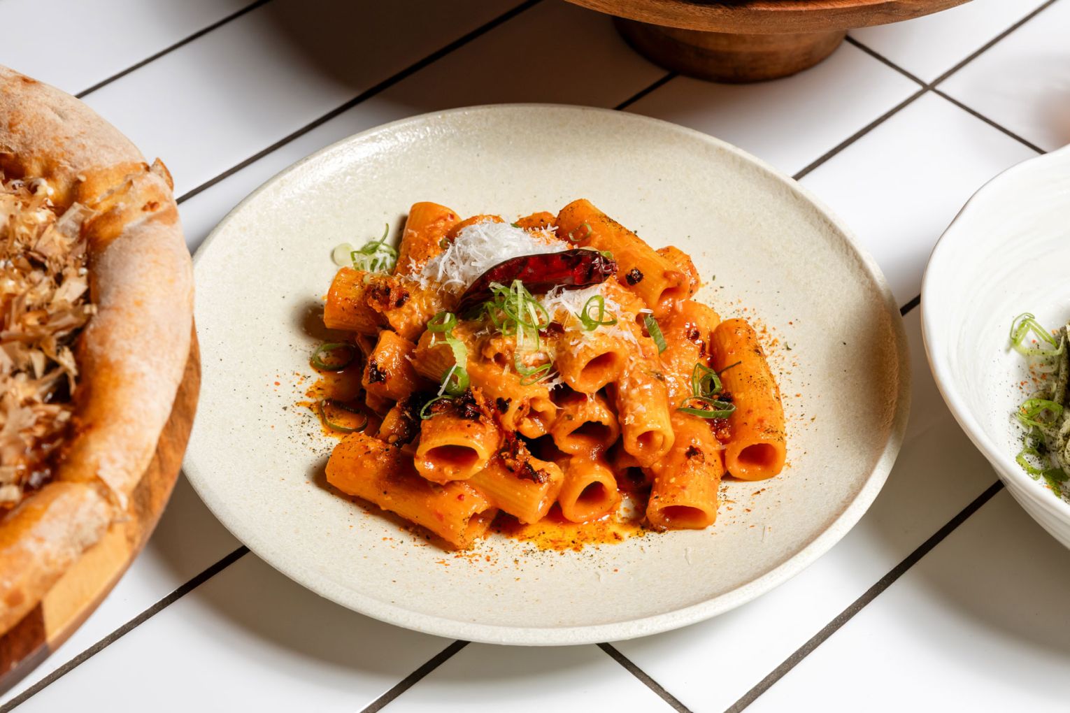 From here, it’s a choose-your-own-adventure type of deal. Make a pit stop for extra snacks like potato fritte with truffle mayo and housemade bread with nori salt, before making tracks for the pasta section. Highlights here include the nori mentaiko (spaghetti with roasted nori, pollock roe, spring onion and parmesan), the karai arabiata (rigatoni coated in spicy chilli oil, shichimi, peanut, tomato and parmesan), and the saikyo carbonara (a glossy mound of spaghetti with bacon, saikyo miso and an onsen tamago).