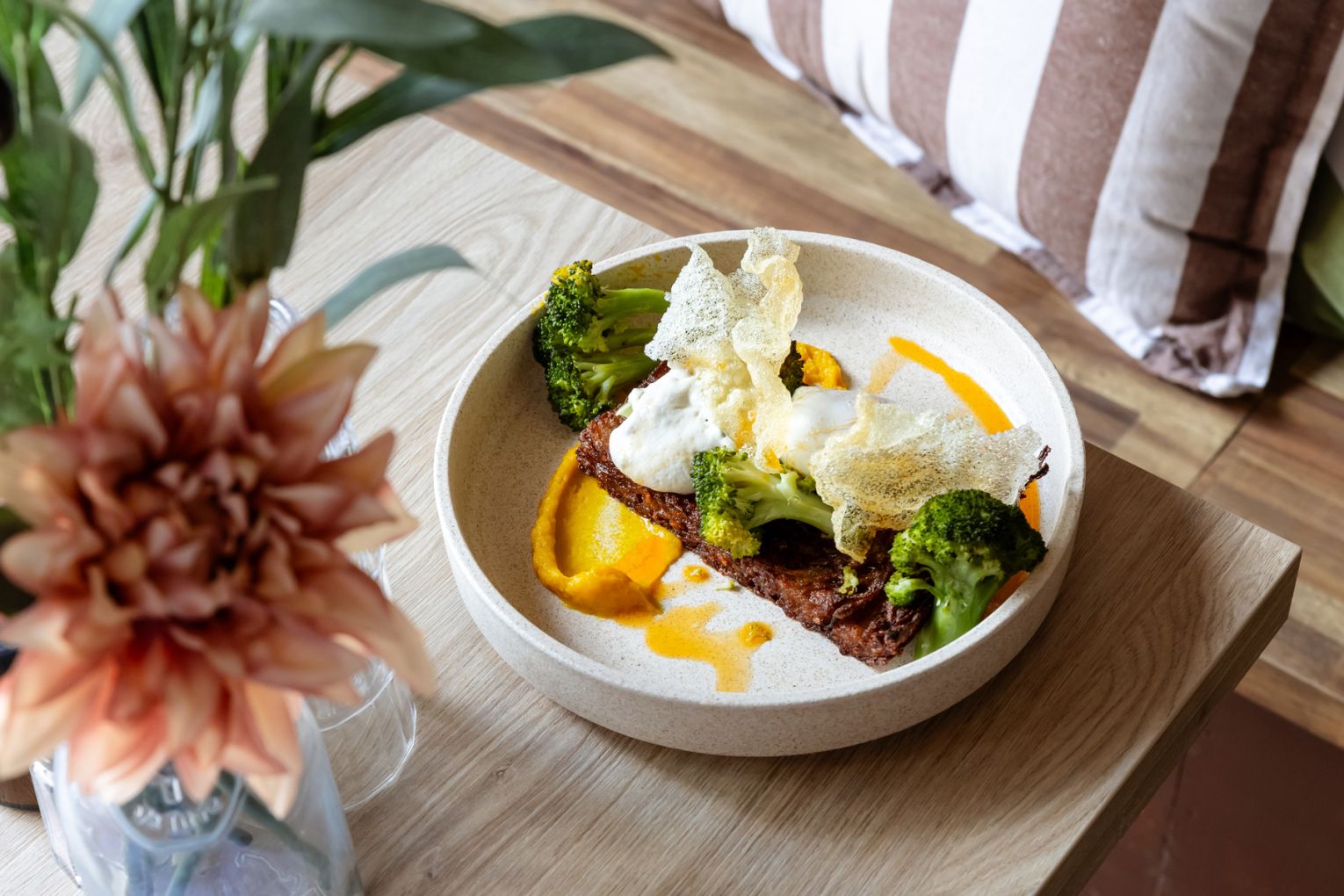 At the same time, over in Teneriffe, Sourced Grocer was fighting the same good fight. Jerome Batten’s Florence Street cafe had been championing an ‘eat local’ approach since it opened in 2011, showcasing produce from Southeast Queensland and the Northern Rivers across dishes like heirloom tomatoes on rye with sunflower puree and black-garlic dressing, and cabbage pancakes with broccoli and goats cheese.