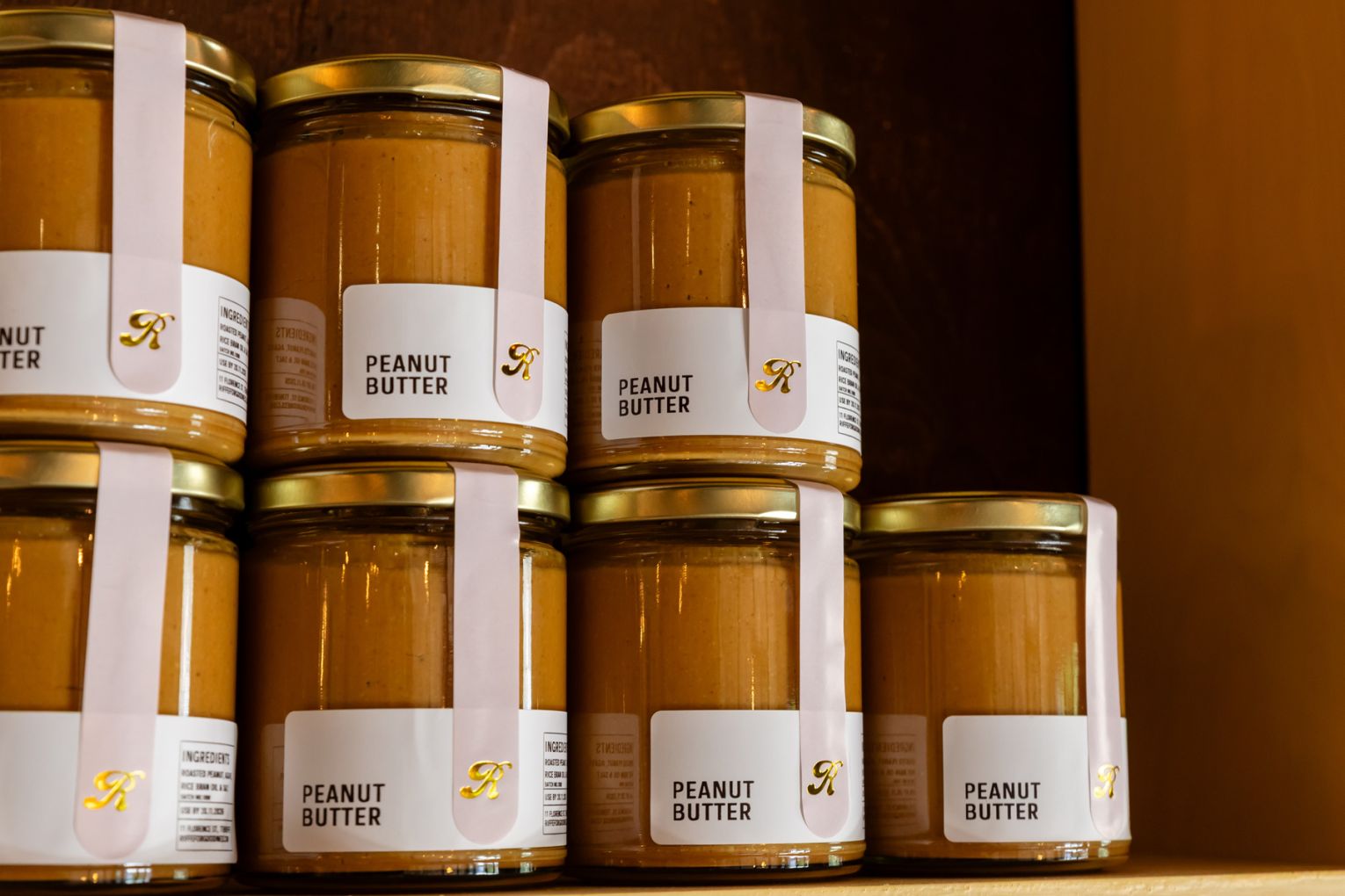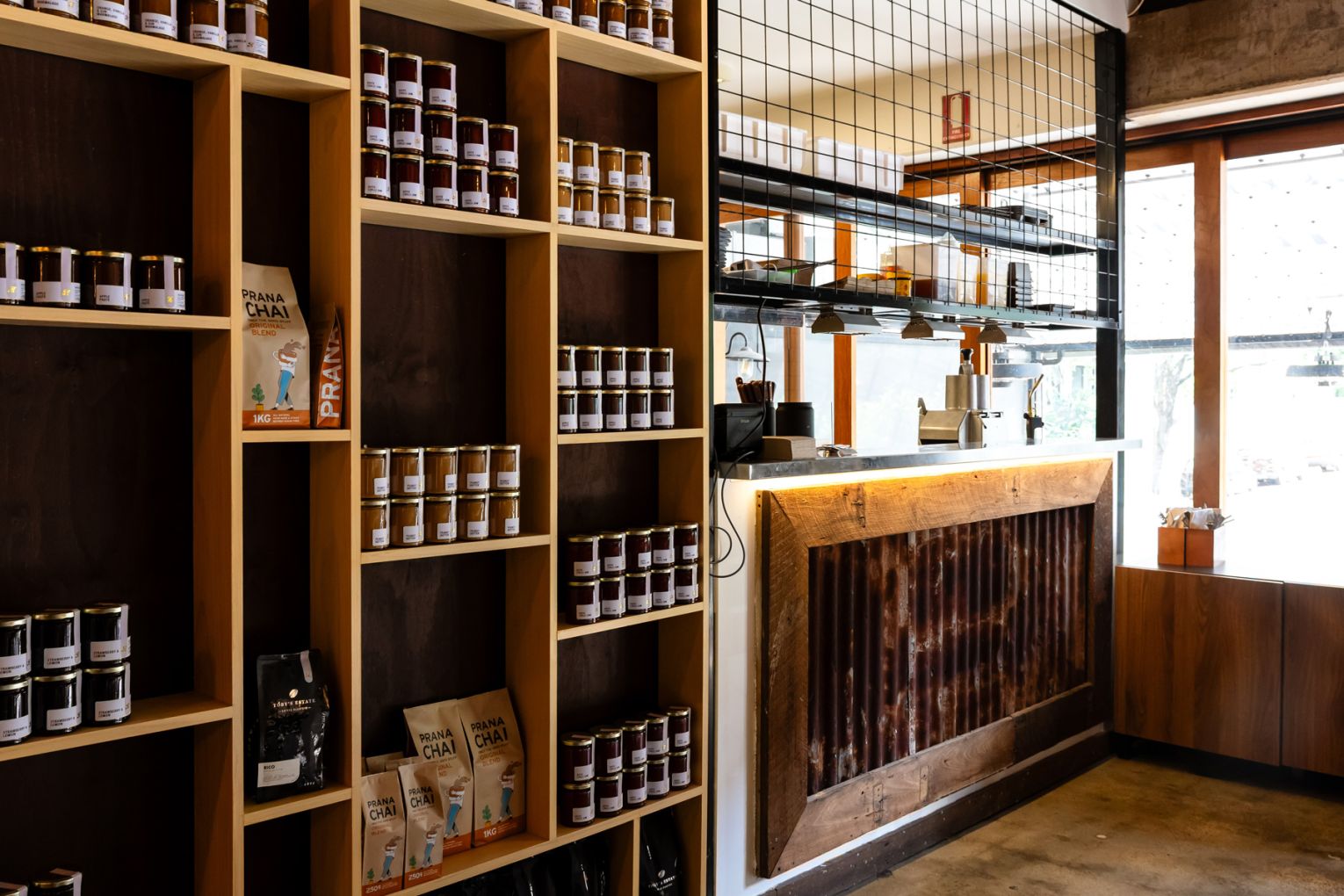 A small retail shelf is stocked with take-home coffee bags and house-made provisions, including peanut butter, chilli jam and apple paste.