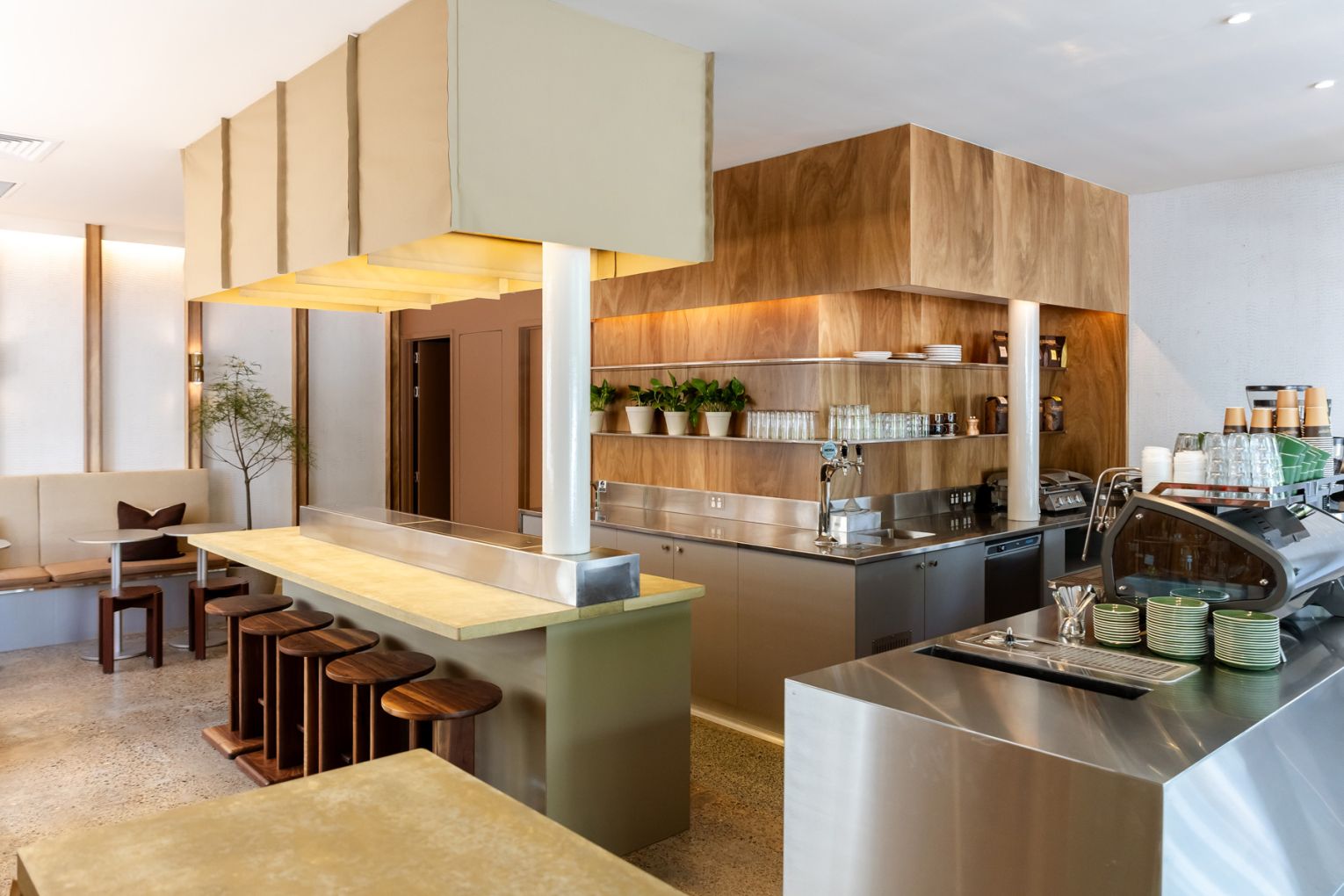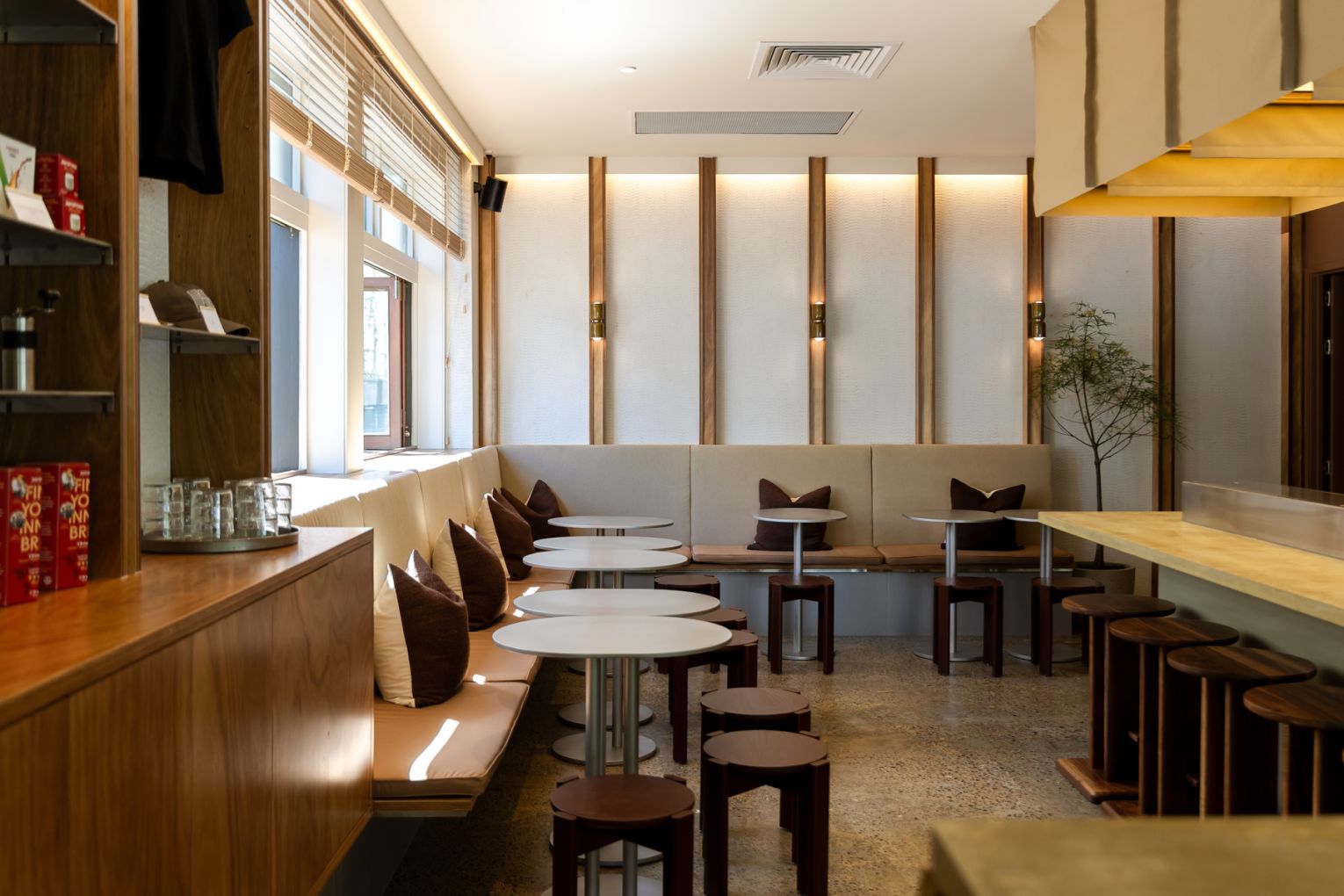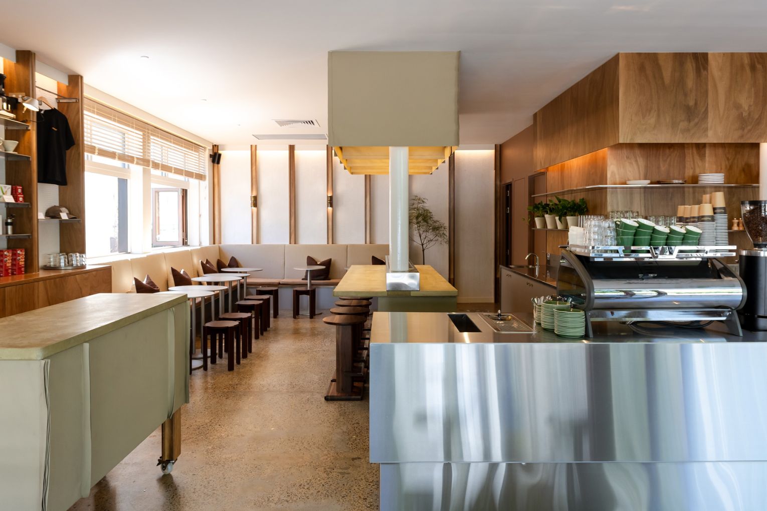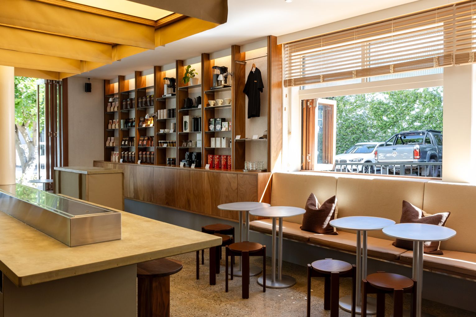 The result is a space that feels contemporary yet relaxed. Large bifold windows add a casual breeziness, while inside, guests can grab a takeaway from the stainless-steel counter or perch at the pour-over bar, the L-shaped banquette, or the low-set timber bench near the entry.