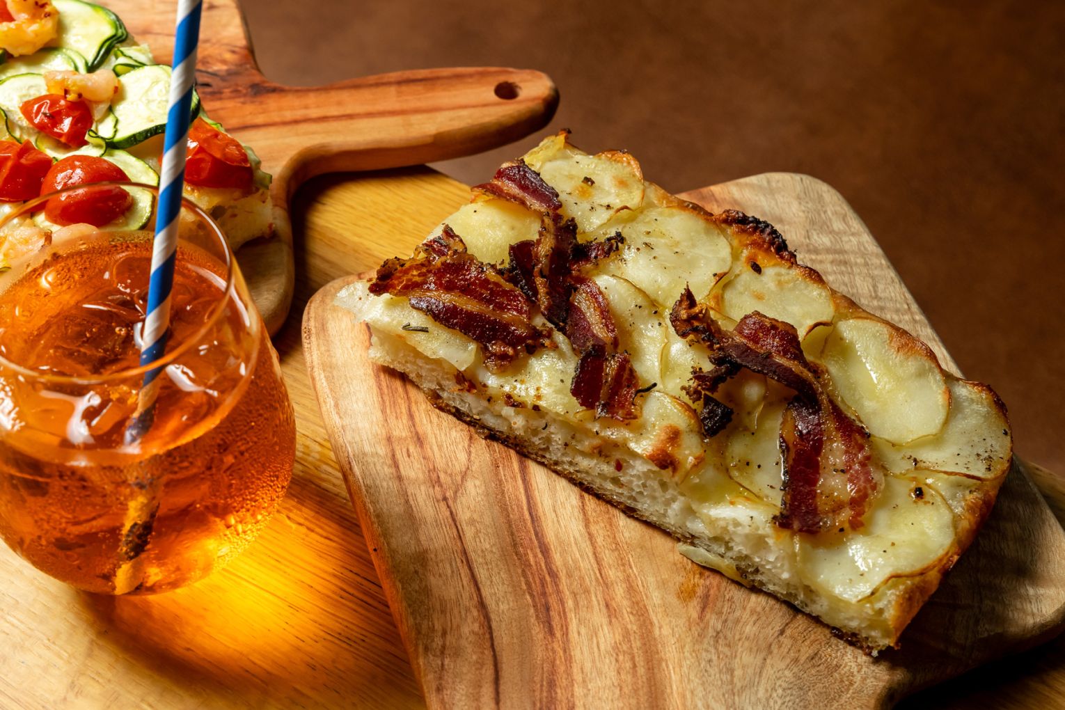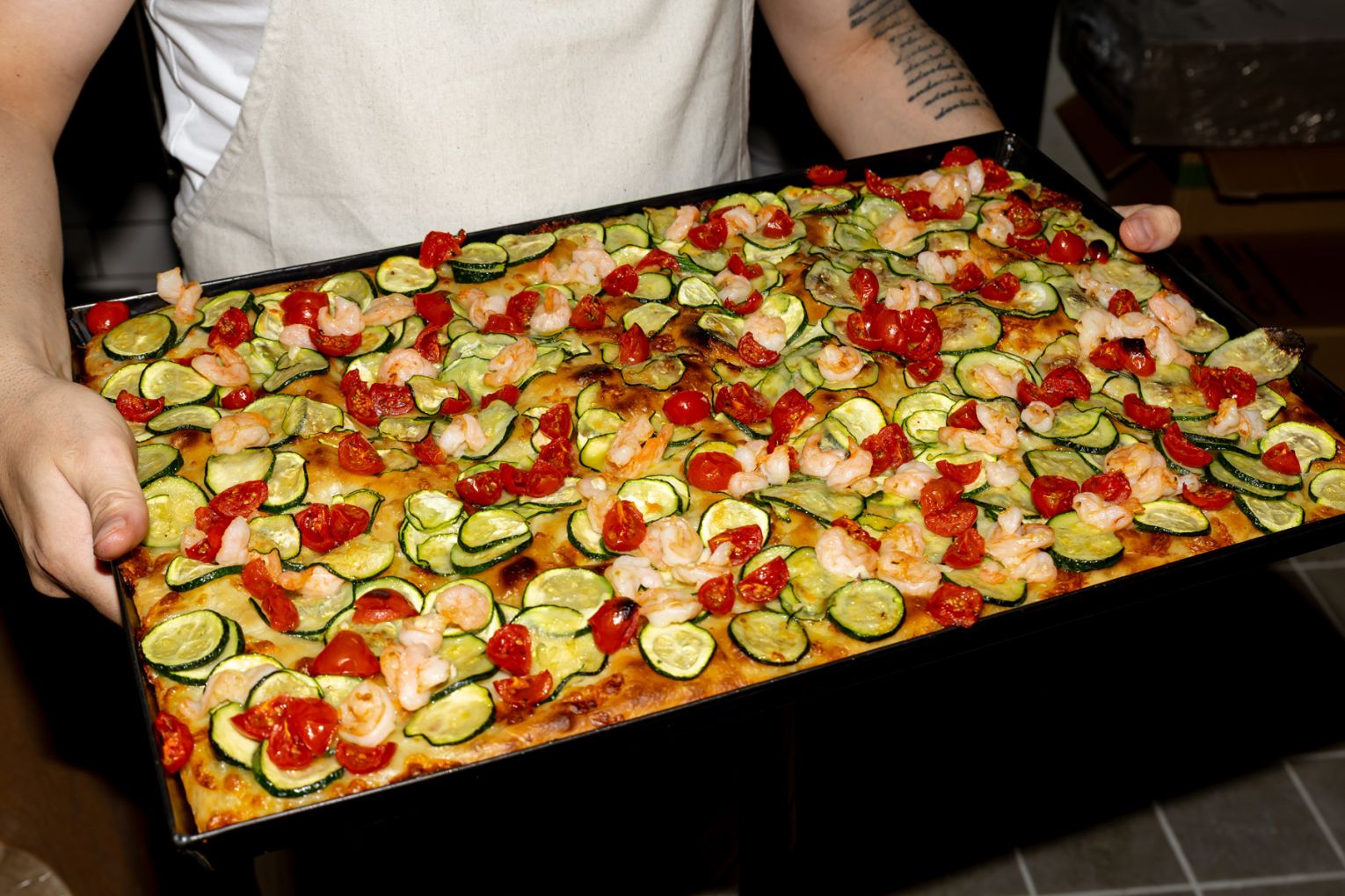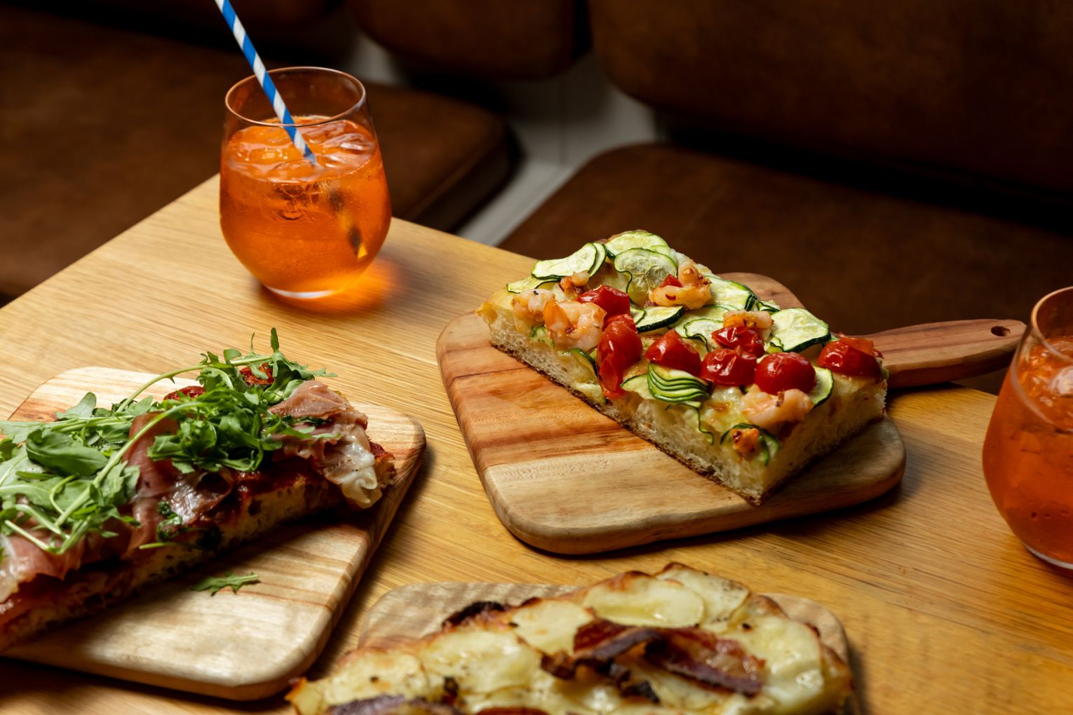 “We’ll definitely have a margherita here, we’ve got a nice salamino sausage pizza that’s a nice balanced pepperoni-style, a potato and pancetta pizza, and we’ve just pulled a really nice chilli and garlic-prawn pizza out of the oven with zucchini and cherry tomatoes,” says Lachlan.