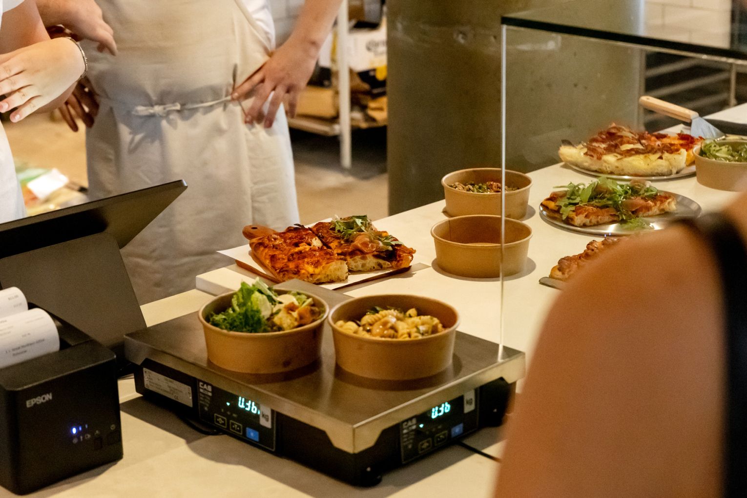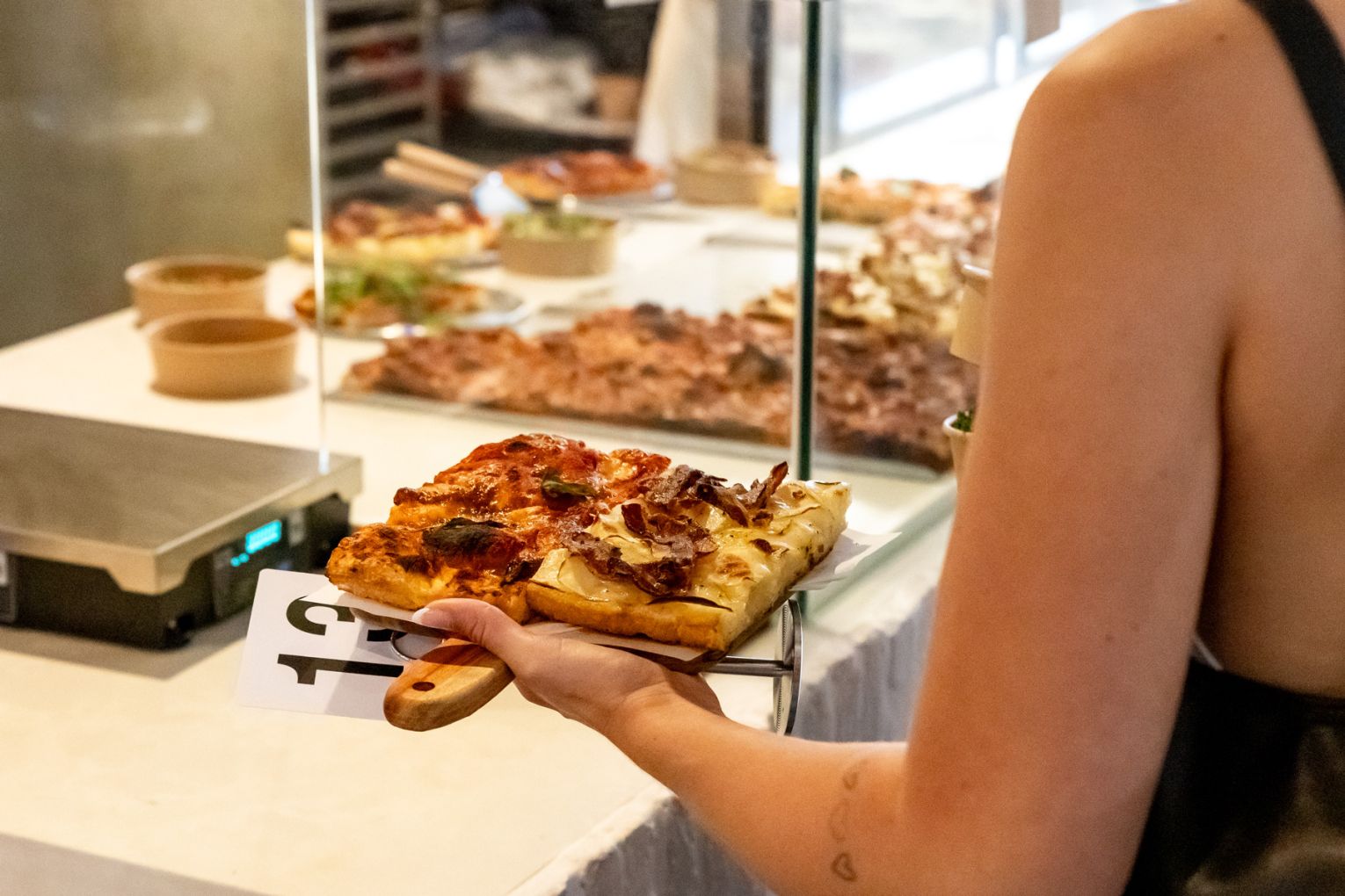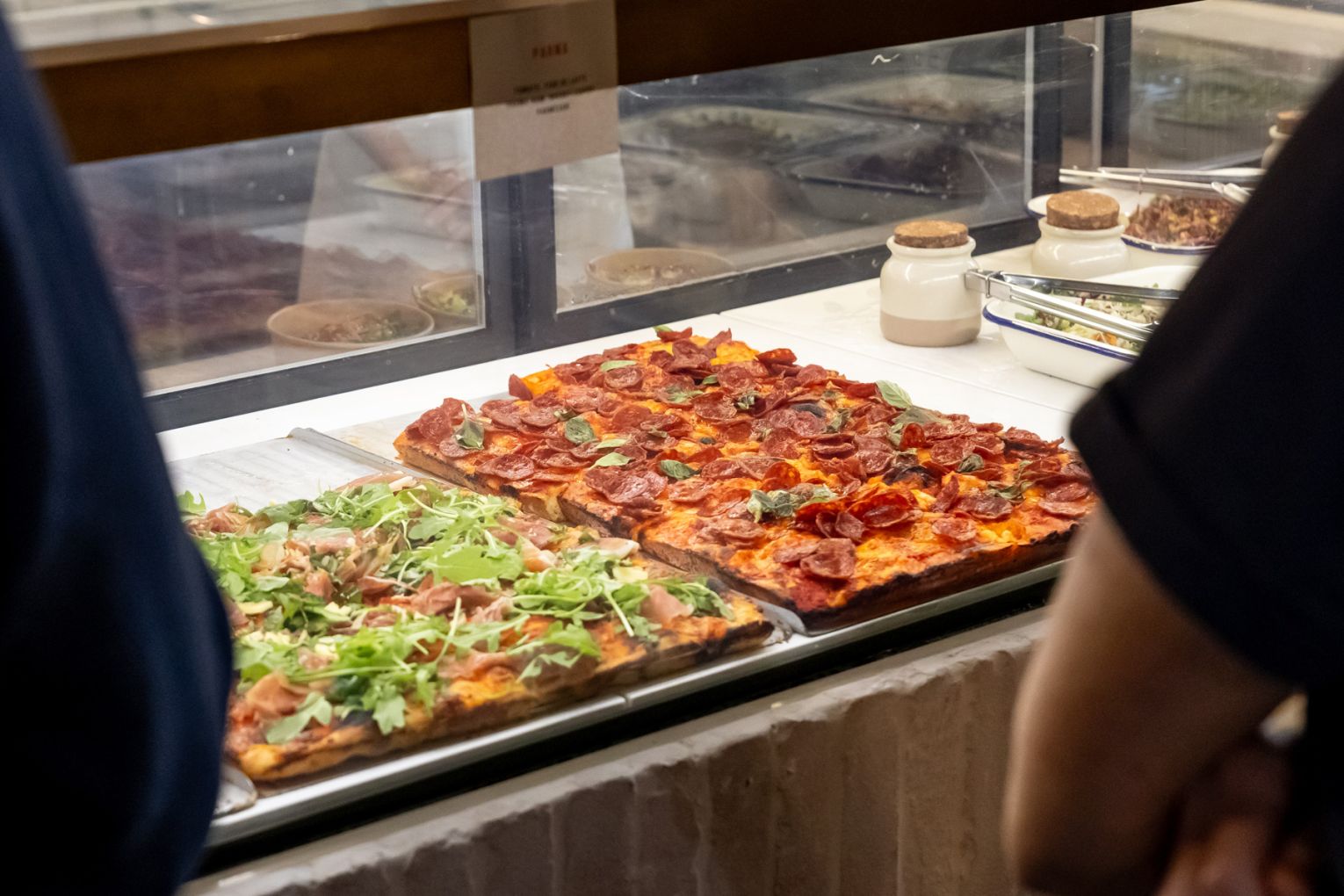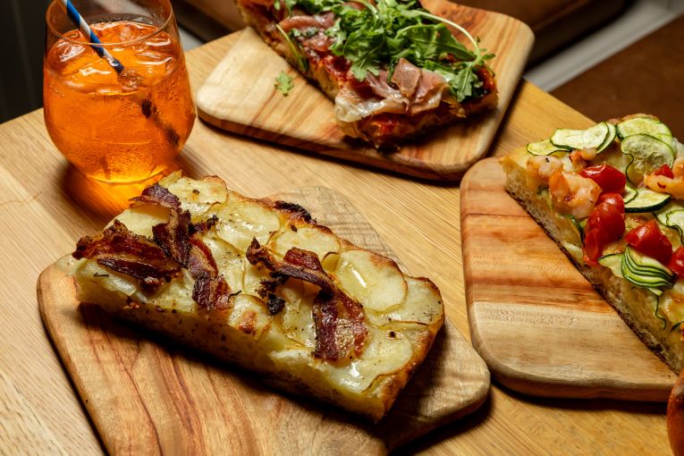 In Teglia’s range is diverse for a pizzeria, going beyond pizza al taglio to include focaccia sandwiches (also served in trays) and fresh salads served by weight. During lunch hours, guests will be able to select from six pizzas and three sandwiches, with the range growing in the evenings to eight different slices.