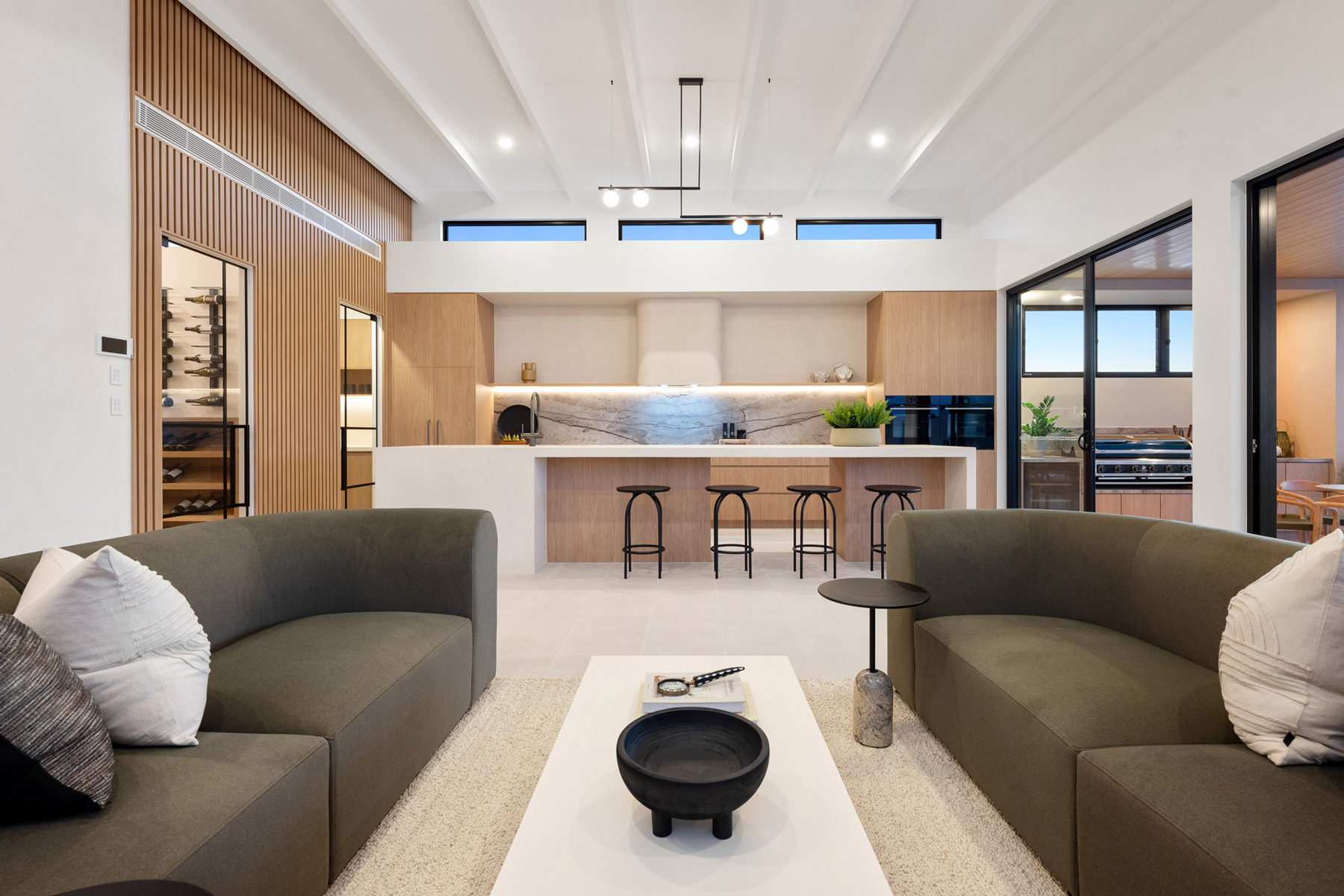 At its heart, a gourmet kitchen fitted with dual ovens and state-of-the-art appliances is designed for serious hosting, flowing into a striking wine room ready to showcase those top drops.