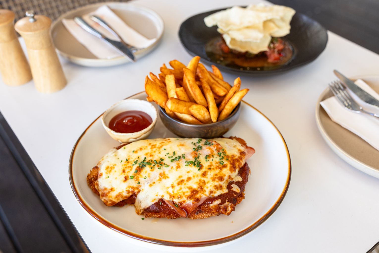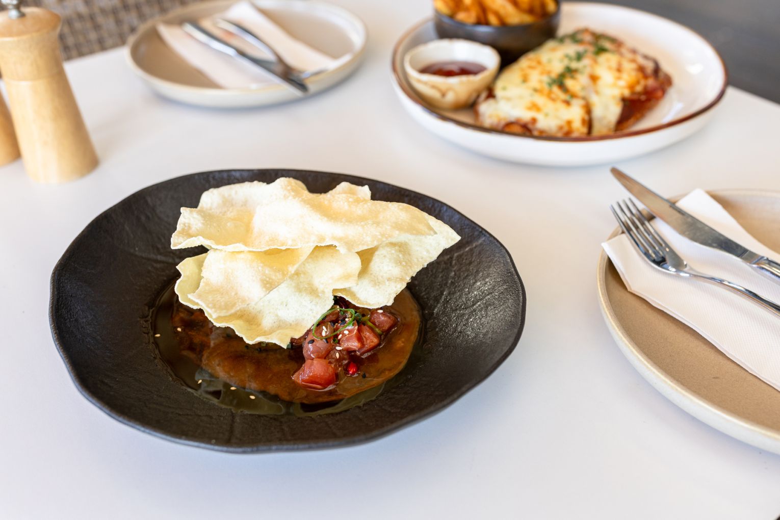 Designed as the kind of place you can roll into for a laidback lunch or easy midweek dinner, the menu offers a clever take on elevated pub classics. Starters include jalapeno poppers, tempura prawns, tuna ceviche, Nonna’s meatballs and a must-try bug-and-prawn roll. Mains range from wild-caught barramundi and charred chicken to a wagyu burger, parmigiana and rotating seafood specials sourced from local trawlers. The grill section showcases standout cuts like lamb cutlets and grain-fed sirloin.
