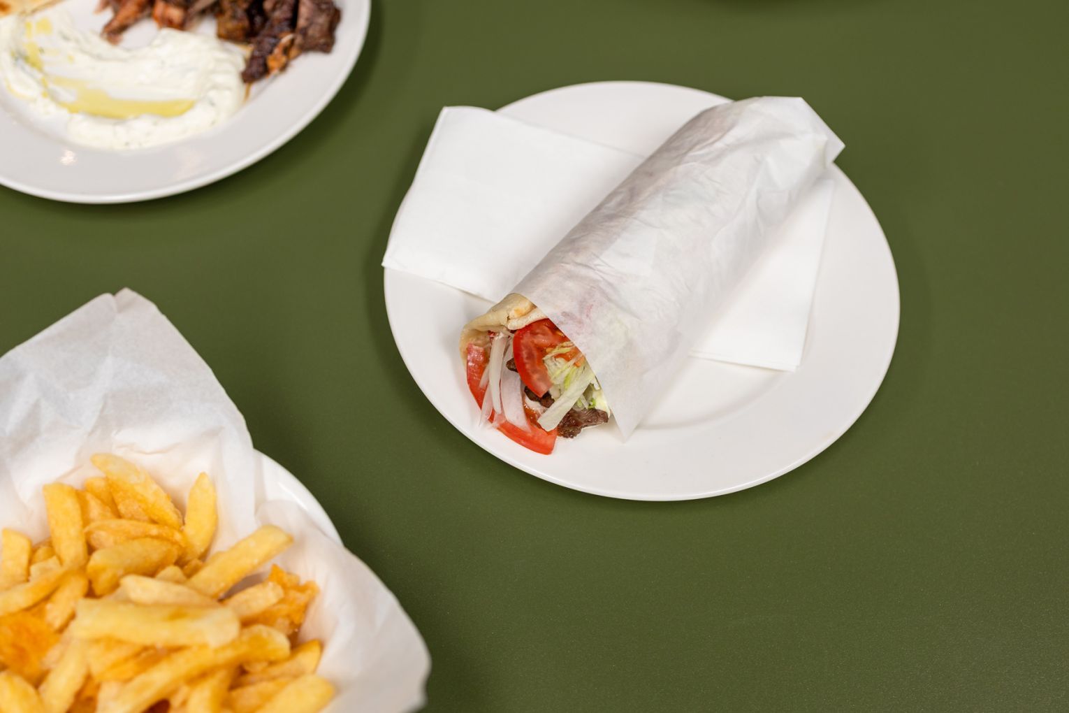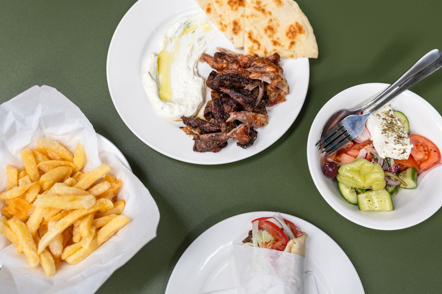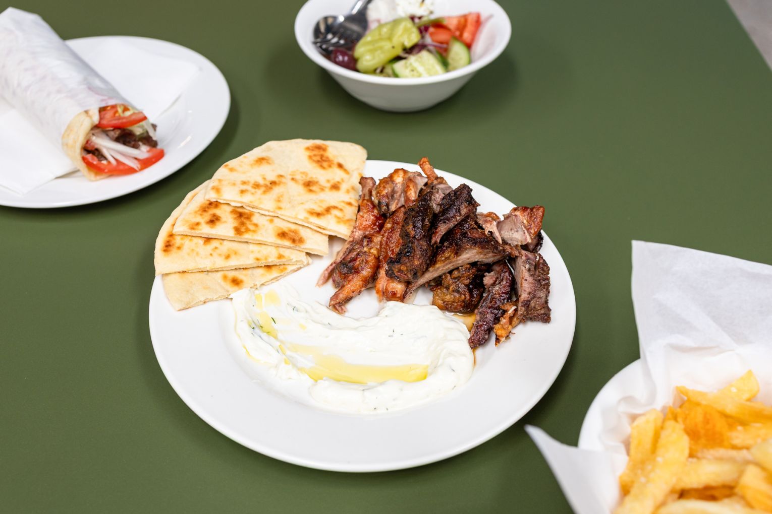 The offering is intentionally simple, centred on lamb and chicken yiros cooked slowly on the spit and served in house-made pita. Chips are hand cut and cooked three times for extra crunch, while sauces, marinades and dressings are all prepared on site. Yiros can be ordered wrapped or plated, with mixed plates available for sharing alongside warm pita, dips and classic sides.