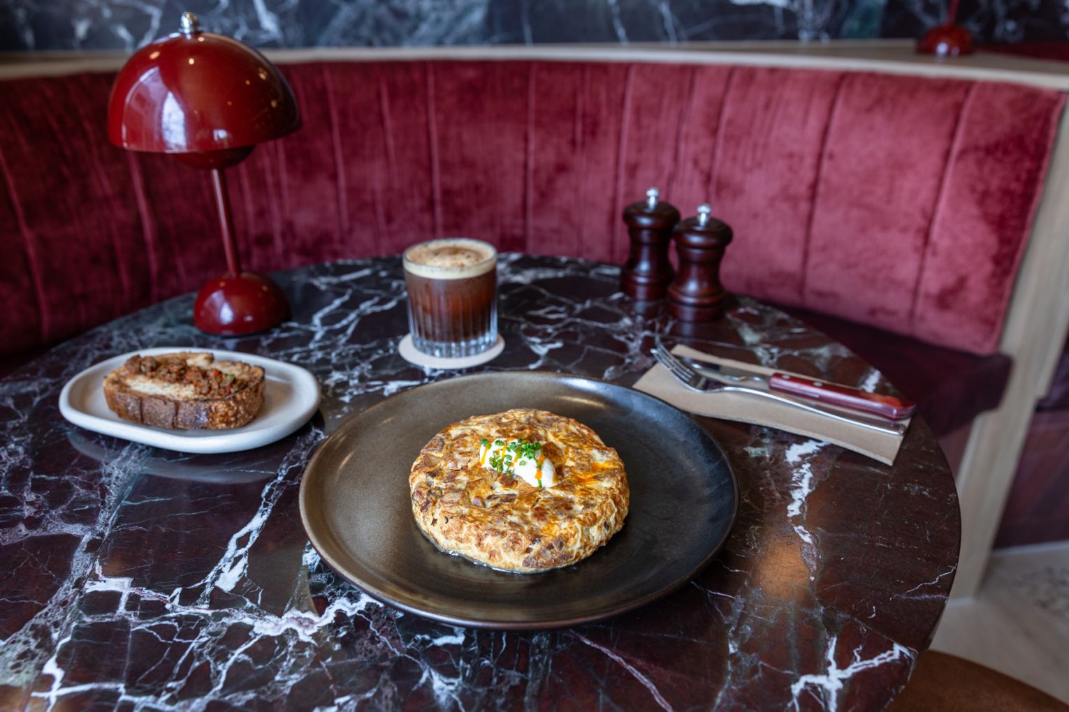 Tucked along Ozone Parade, Velvet Cafe & Lounge is a stylish new addition bringing a little old-world hospitality to Miami. The vision of Stefany Rincon and developer John Potter, the aesthetic venue delivers deep maroon tones, golden light and plush velvet booths. On the menu, Colombian chef Jose Pineros elevates breakfast and lunch to dinner status with dishes like Spanish tortilla with chimichurri, truffle-gouda folded eggs and asado ribs glazed in chimichurri. Blackboard Coffee Roasters pours alongside cocktails such as the Coffee Yuzu G&T and Espresso Carajillo. Step outside to the sun-dappled alfresco area, where smaller tables and one coveted group setting invite you to linger a little longer.