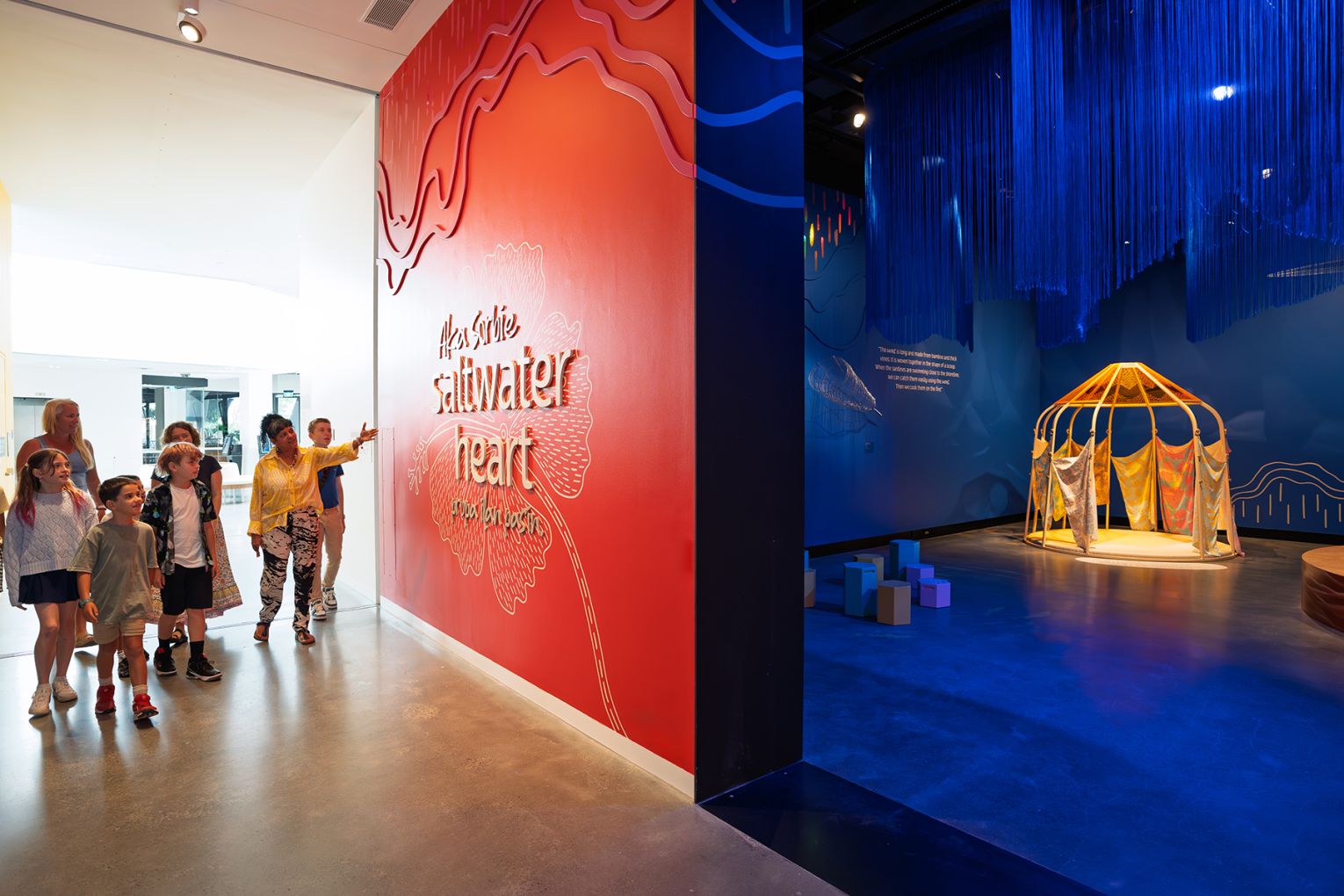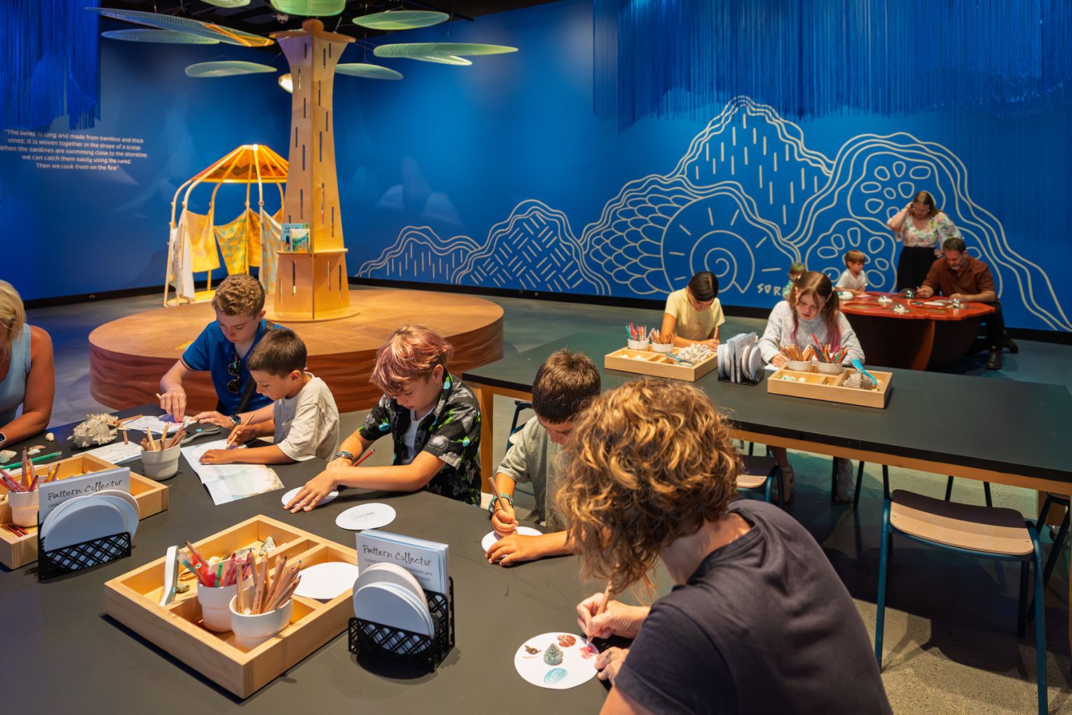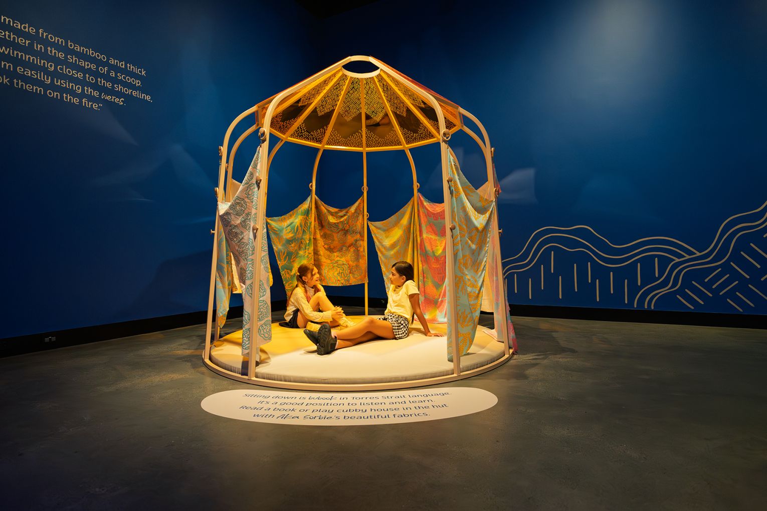The exhibition draws on themes of culture, family and the ocean, brought to life through bold colour and intricate patterns in a sensory, hands-on experience that encourages curiosity and learning. Visitors can immerse themselves in Lisa’s underwater world of coral and fish, play cubby house in the island hut with fabric, and make art Aka Sorbie’s table.