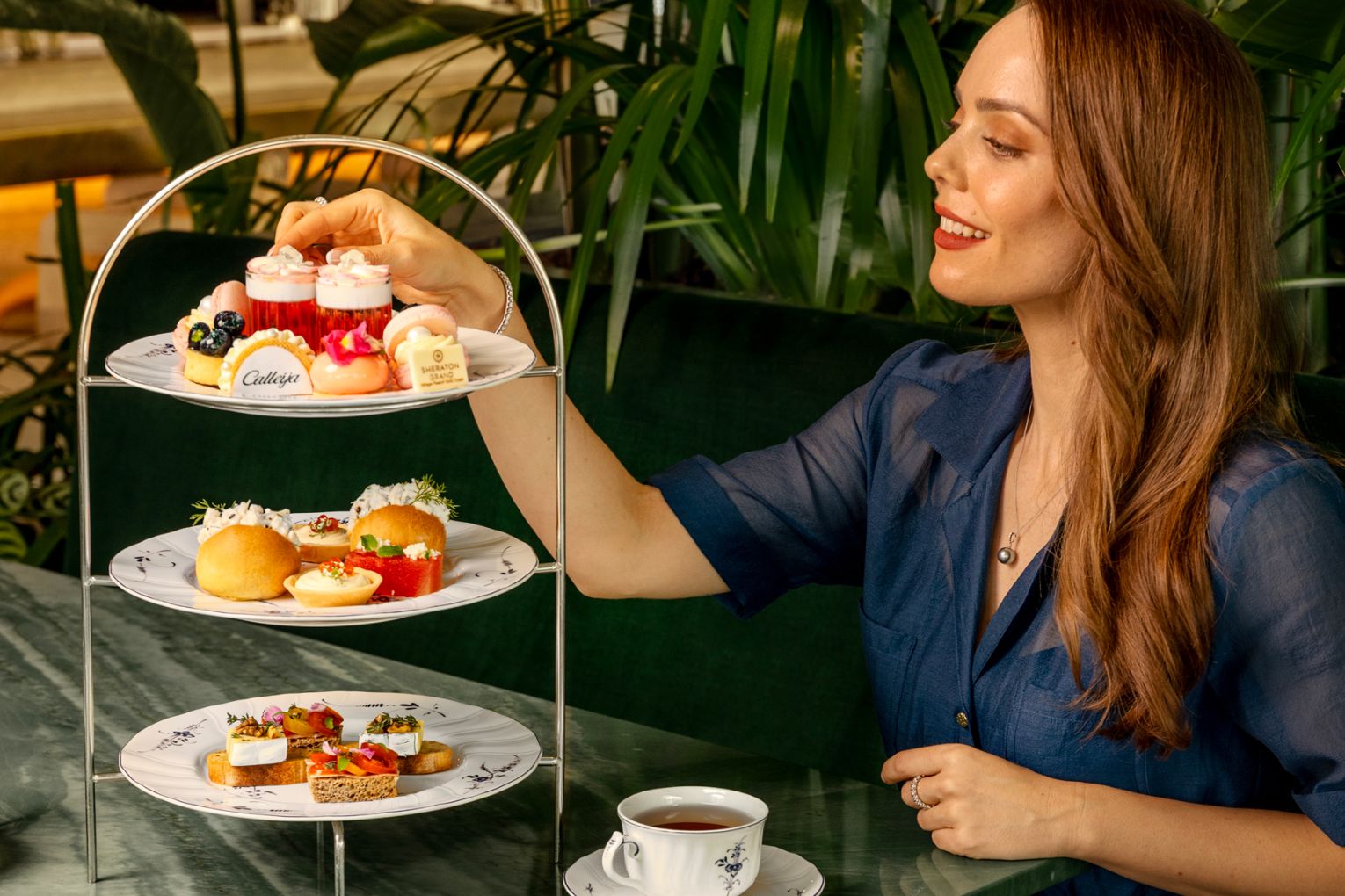 High-tea guests are welcomed with a Sapphire Sour cocktail before settling in for a refined selection of savouries, including salmon caviar with a lemon and dill cream-cheese tart, smoked chicken and tarragon mayo on brioche, prosciutto with heirloom tomatoes and herbs on rye, Nimbin Valley Black Cow cheese with candied walnuts and infused honey, and champagne-compressed watermelon topped with Persian fetta and mint.