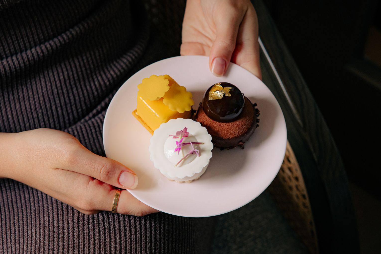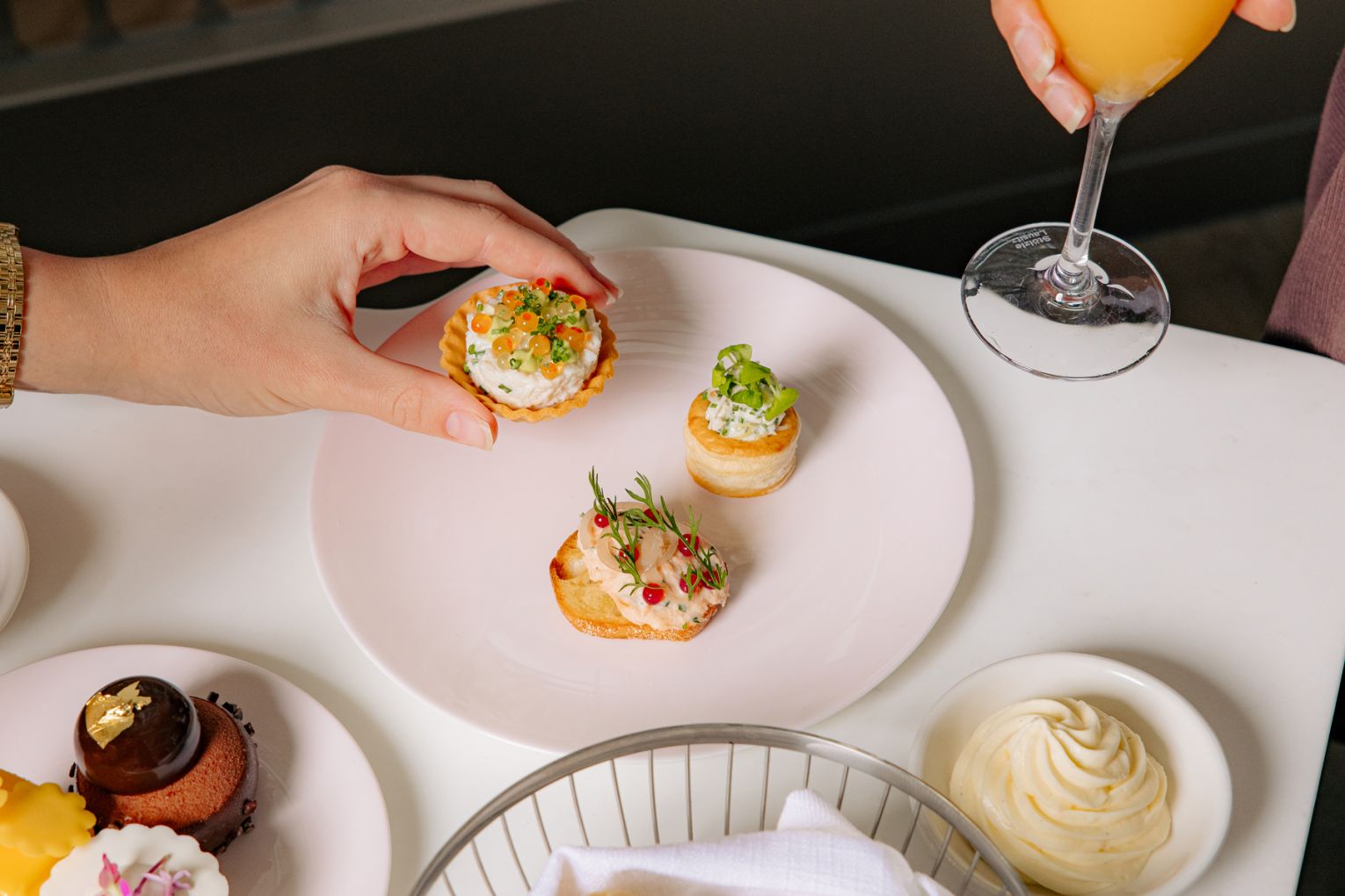 The savoury line-up leans classic with a twist, from duck-egg quiche Lorraine with gruyere and speck, to crab tartlets layered with avocado, yuzu and salmon roe. A crisp baguette layered with hot-smoked trout rillettes, gin-infused salmon roe, pickled shallot and dill is joined by smoked-chicken and celeriac remoulade vol-au-vents.