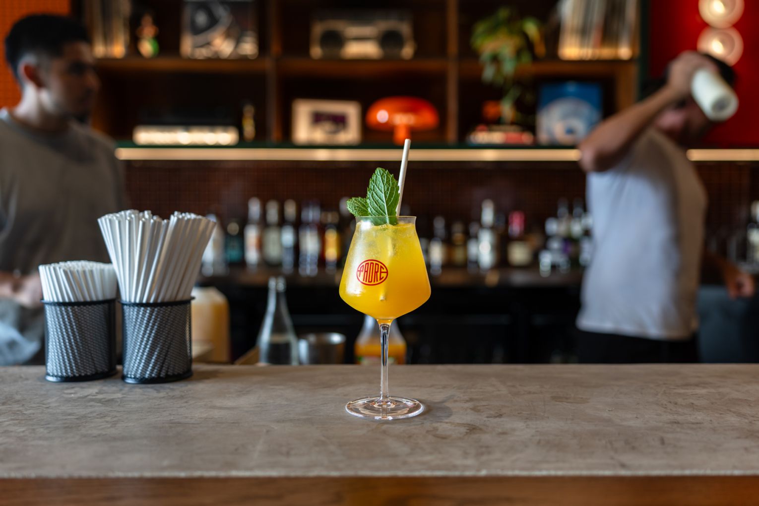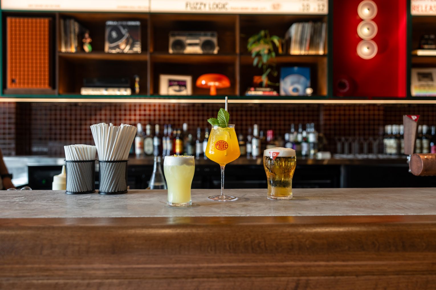 Step inside and the energy hits immediately. Warm timber, acid-green framing, a curved bar wrapped in glossy mosaic tiles. It’s nostalgic and cool without trying. And instead of the usual rainbow of spirits, the backbar is stacked with vintage vinyl, old Polaroids and knick-knacks collected from decades past.