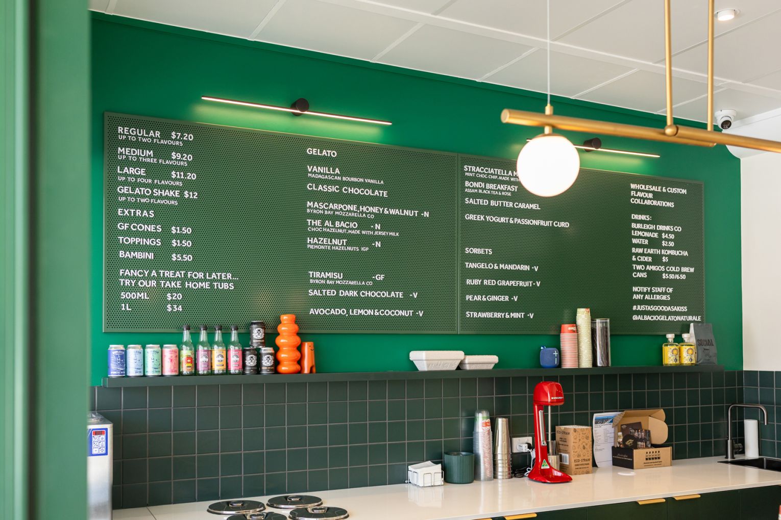 Al Bacio Gelato Naturale’s branding was done by Pennybridge Creative, with the venue brought to life by Zero 9 Constructions, nods to the coastal-meets-classic aesthetic that Burleigh does best. A little vinyl decal on the floor reads ‘as good as a kiss,’ a sweet reminder of what Al Bacio stands for – joy, authenticity and a love of life’s simple pleasures.